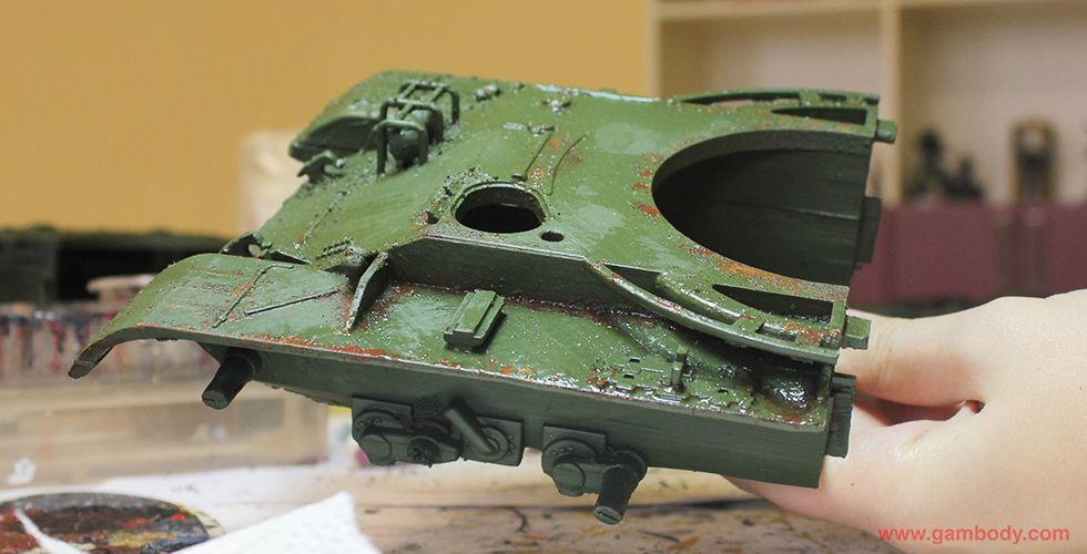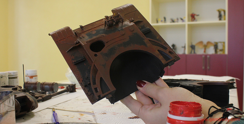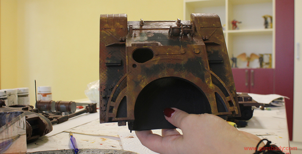 First, the model was primed and covered in brownish-rusty paint. The painter used different shades of yellow, red, and brown to recreate that rusty color.