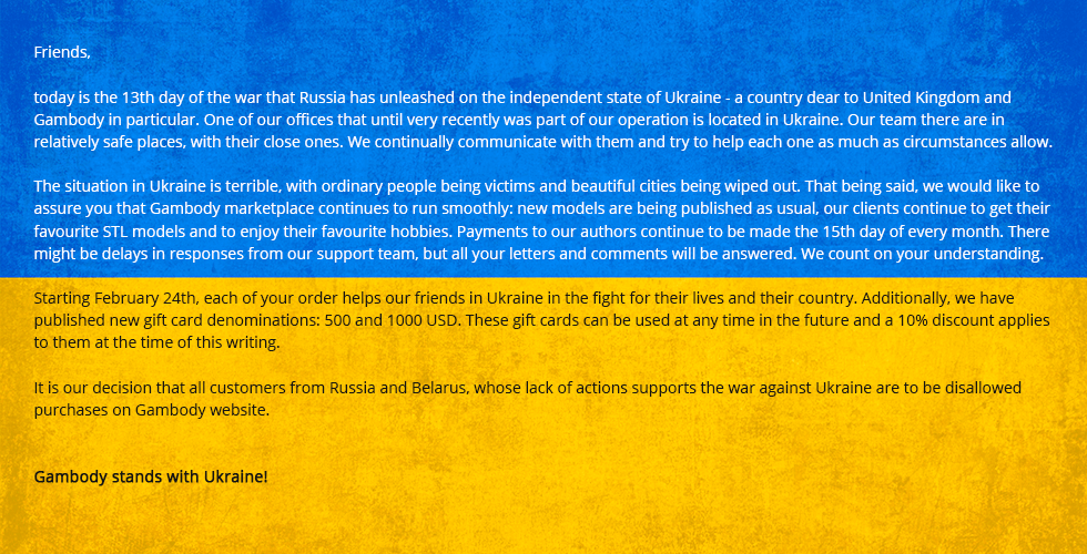 3. Gift Card coupon can only be used at gambody.com for buying STL files for personal use.