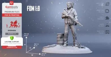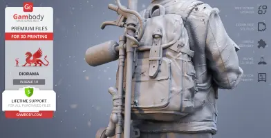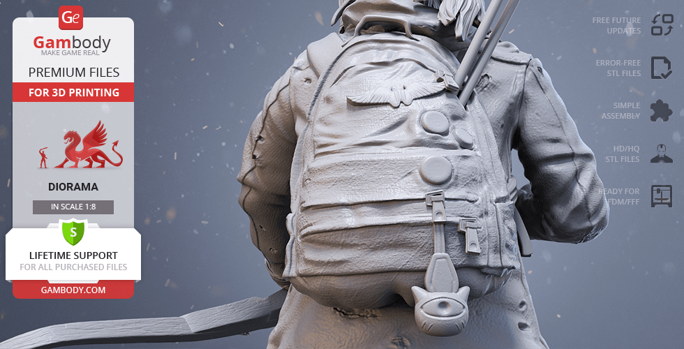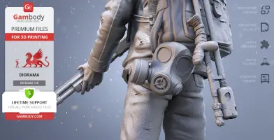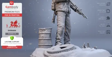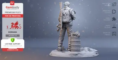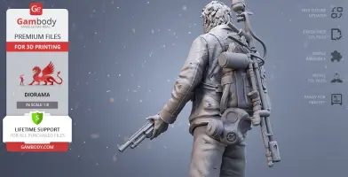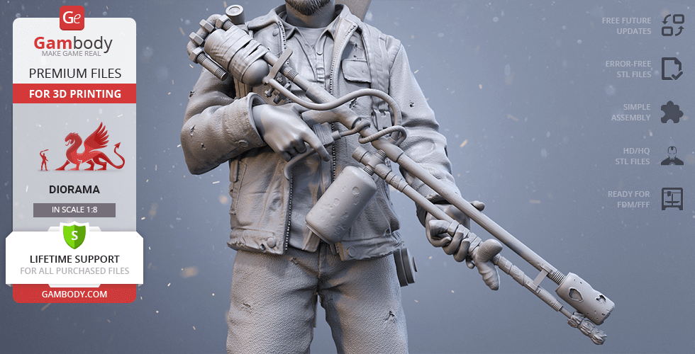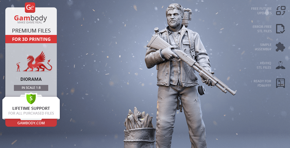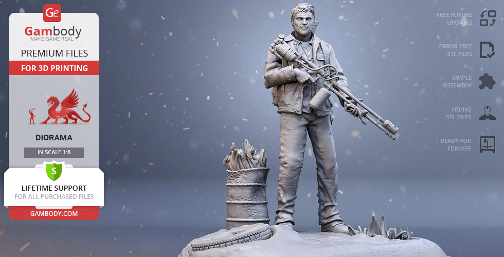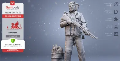 3D printed model of a rugged man holding a rifle, wearing a jacket with detailed textures.
