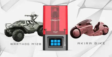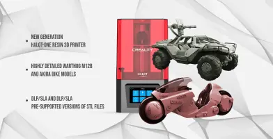 This bundle consists of Creality HALOT-ONE Resin 3D Printer, Warthog M12B 3D Printing Model, and Akira Bike 3D Printing Model. The 3D printing models comprise the files in StereoLithography (.STL) format that is optimized for DLP/SLA 3D printing.