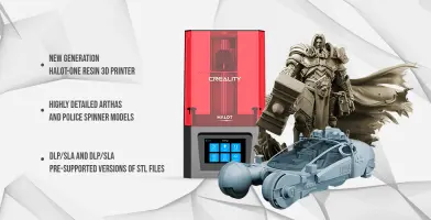 This bundle consists of Creality HALOT-ONE Resin 3D Printer, Arthas 3D Printing Figurine, and Police Spinner 3D Printing Model. The 3D printing models comprise the files in StereoLithography (.STL) format that is optimized for DLP/SLA 3D printing.