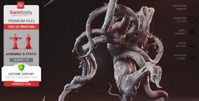 A muscular, monstrous figure with tendrils and an open mouth in a dynamic pose, ready for 3D printing.