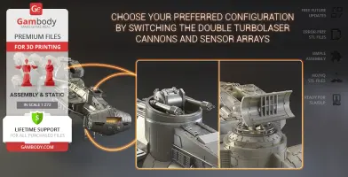 - You can choose your preferred configuration by switching the dorsal and ventral doubleturbolasercannons and a sensor array;