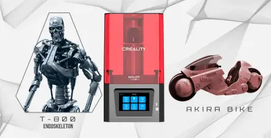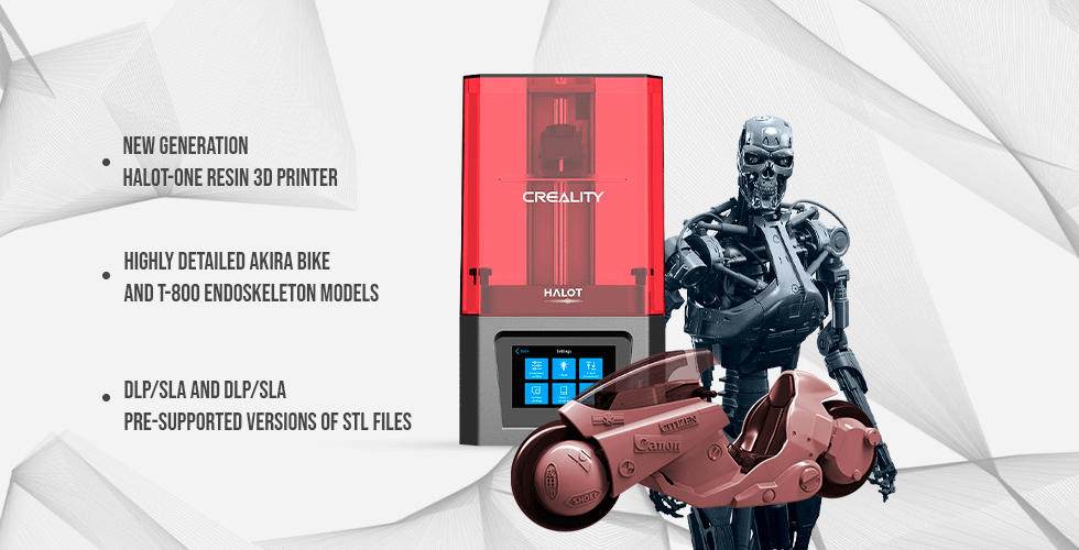 This bundle consists of Creality HALOT-ONE Resin 3D Printer, T-800 Endoskeleton 3D Printing Figurine, and Akira Bike 3D Printing Model. The 3D printing models comprise the files in StereoLithography (.STL) format that is optimized for DLP/SLA 3D printing.
