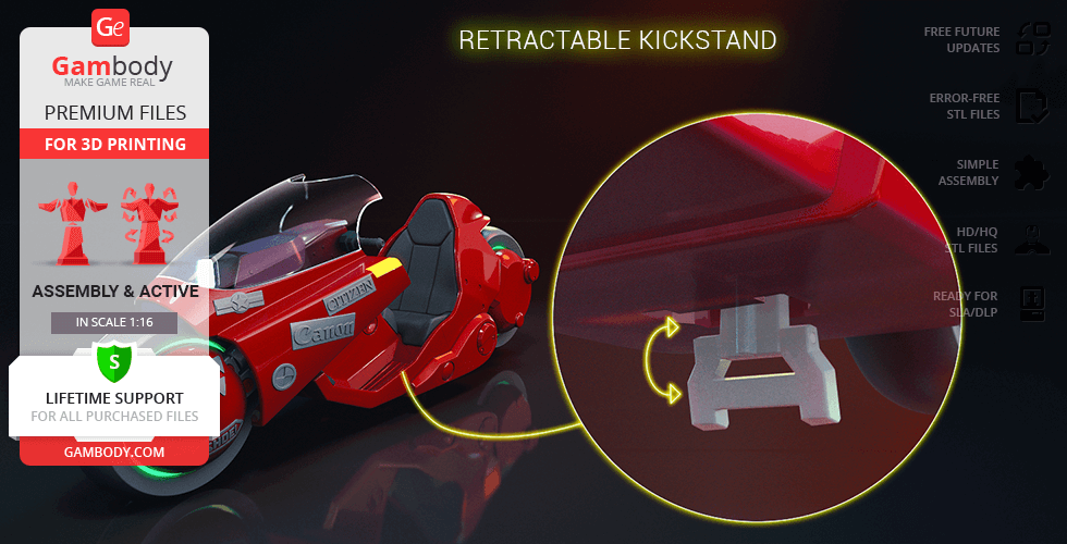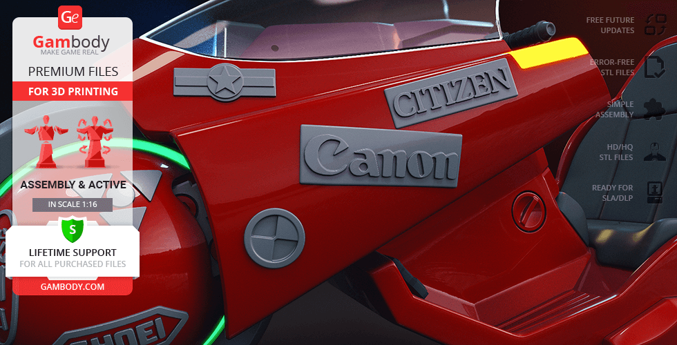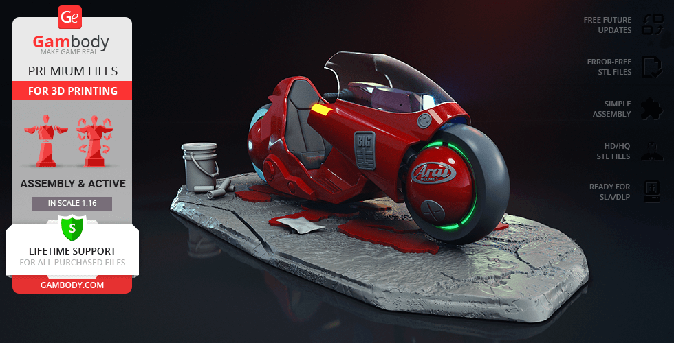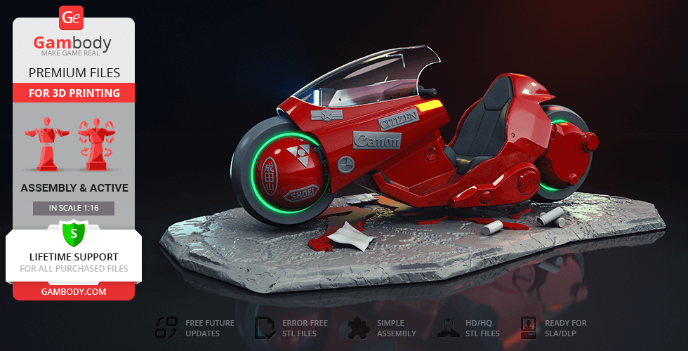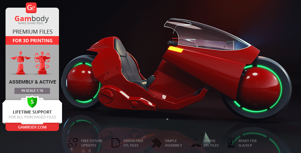 Both T-800 Endoskeleton figurine andAkira Bike model for 3D Printing were carefully modelled by our talented contributing 3D artists and thoroughly moderated and adapted for 3D printing by Gambody team. This bundle comprises the DLP/SLA and DLP/SLA Pre-supported versions that are specifically adapted to be printed on resin 3D printers such as HALOT-ONE. The process of adaptation presupposes that practical aspects of printing the model using the DLP/SLA/LCD technology are taken into account, and the model's scale and cutting are chosen to ensure an optimum result of printing.