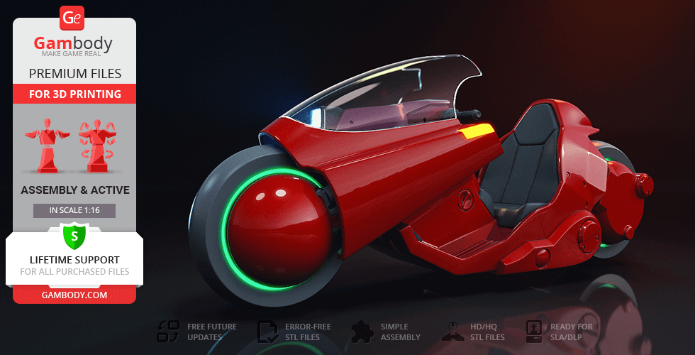 - 2 versionsof Akira Bike STL files - DLP/SLA and DLP/SLA Pre-supported