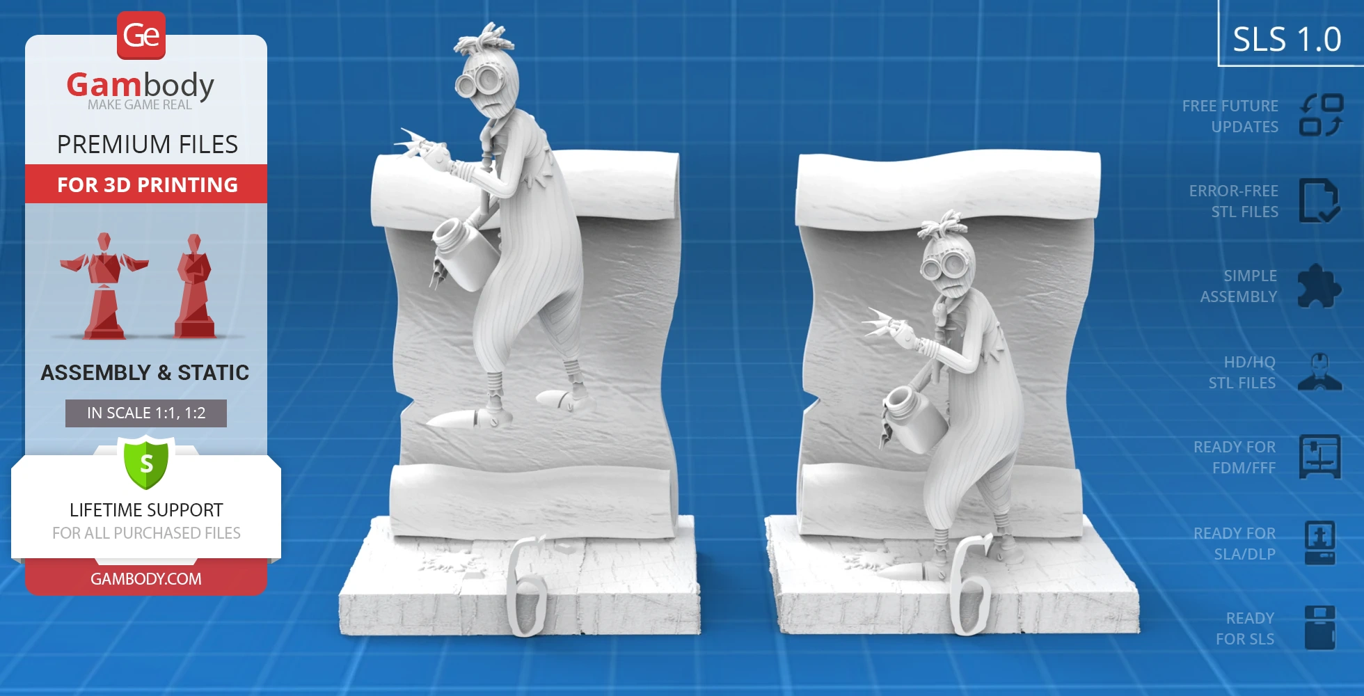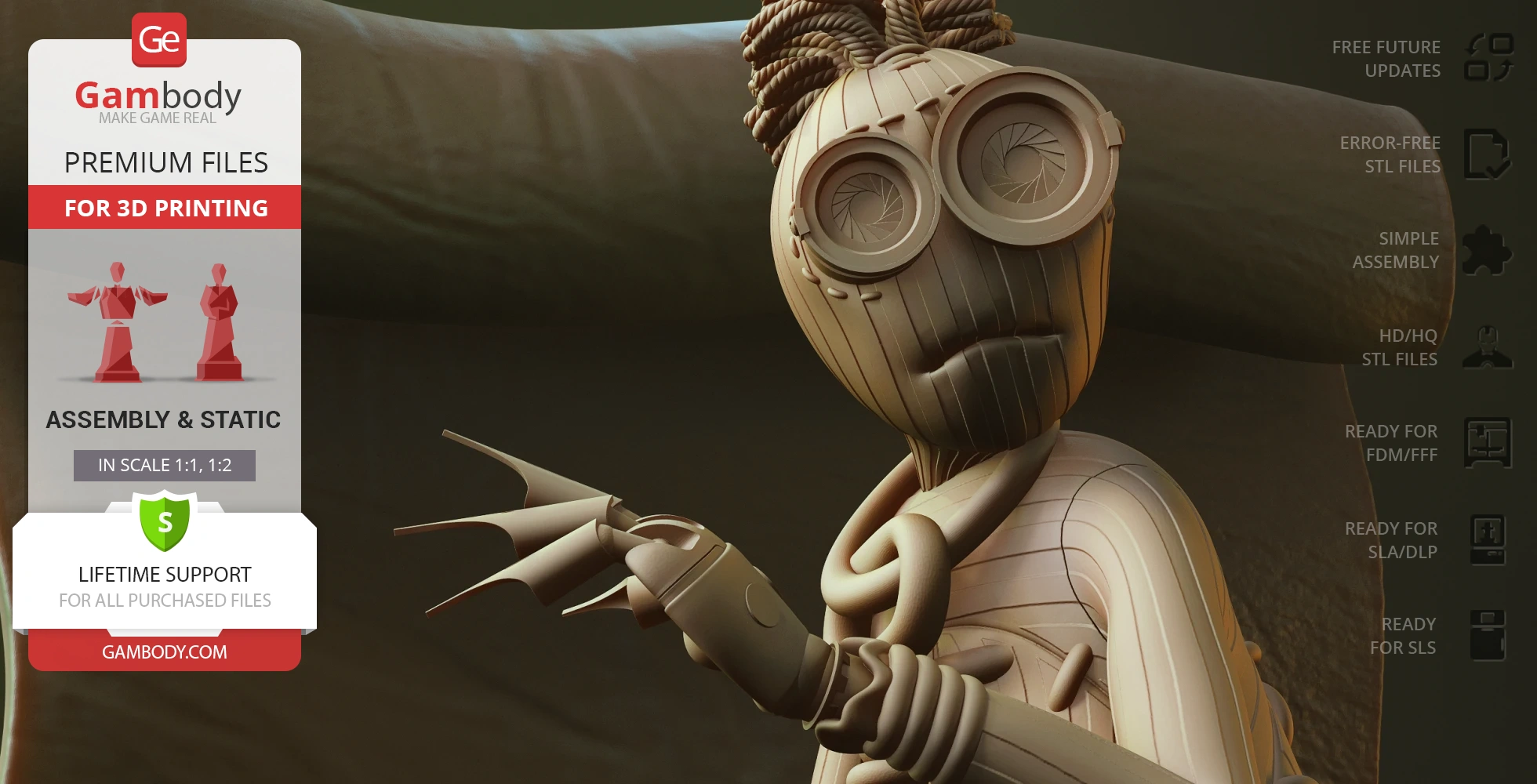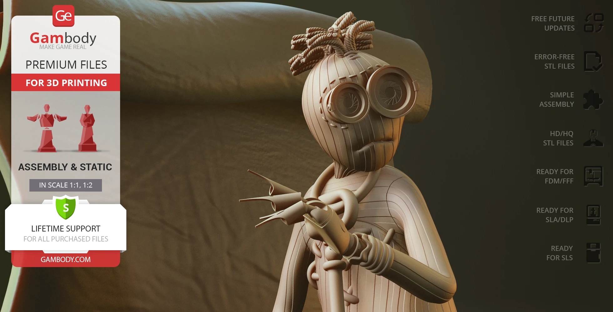 Our contributing 3D artist could not leave without attention 6 and created this unique and authentic 3D printer model. 6 is designed as a striped stitchpunk with fastenings reeled on his neck, wrists, and ankles. The top of the head of 6 is adorned with a tuft of thick threads, and a large old-fashioned key hangs on his neck. The disproportionate eye lenses play a large part in reflecting the character of 6 and translating his emotions. A truly unusual feature of 6 is his fingers which are made of ink pen nibs, and the scene is perfectly chosen to present 6: the author depicted the character holding an inkwell and half-turned to the viewer with a roll of paper on the background. The authentic and filmic look of this stitchpunk is what will make your new 3D-printing collectible amaze everyone!