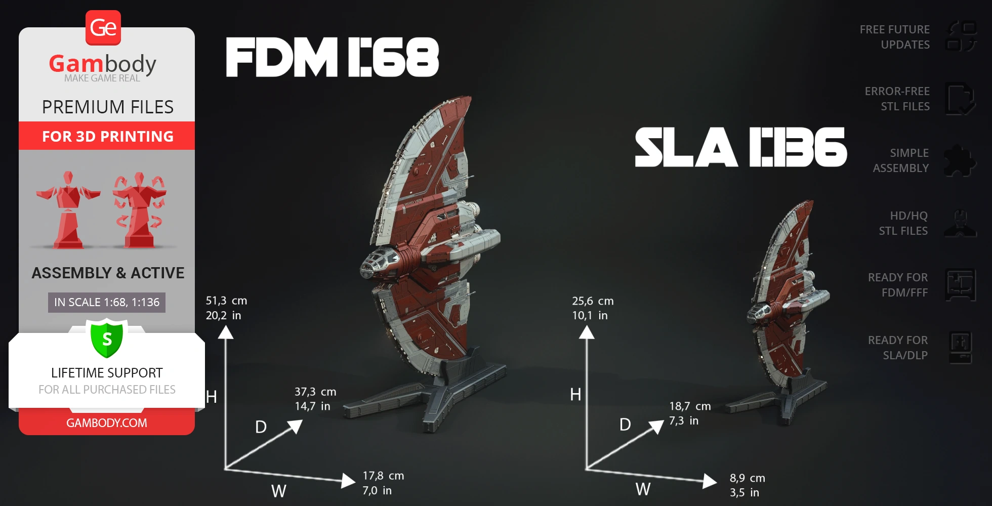 The 3D model’s scale was calculated from the length of the T-6 Jedi Shuttle. The 3D printer design’s chosen scales are 1:68 for the FFF/FDM version and 1:136 for the DLP/SLA version.