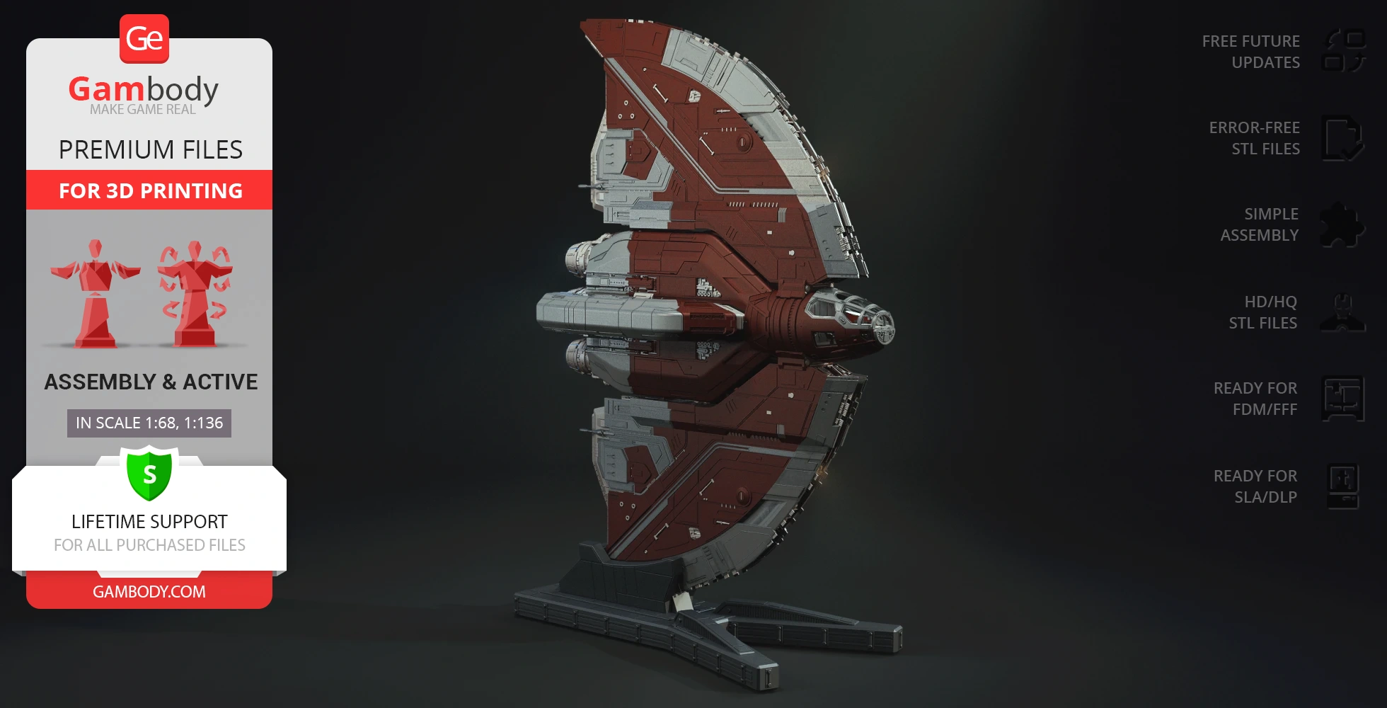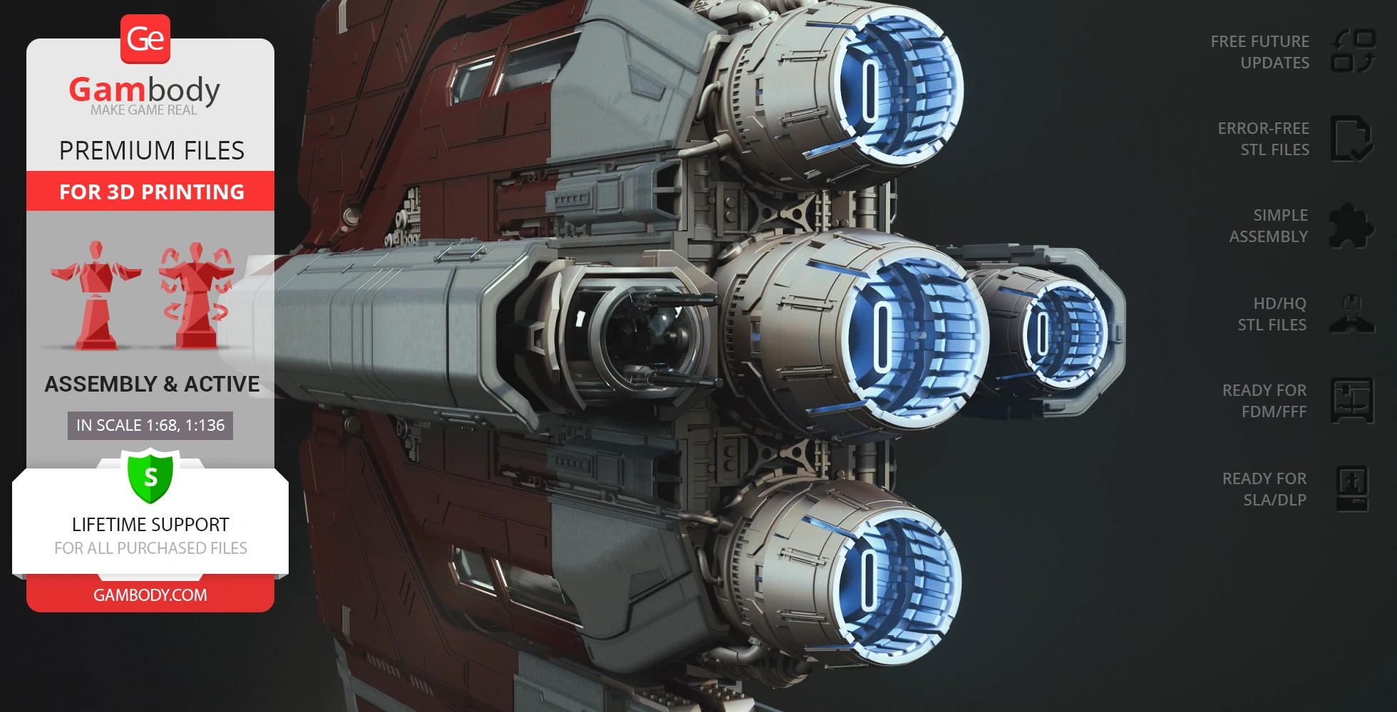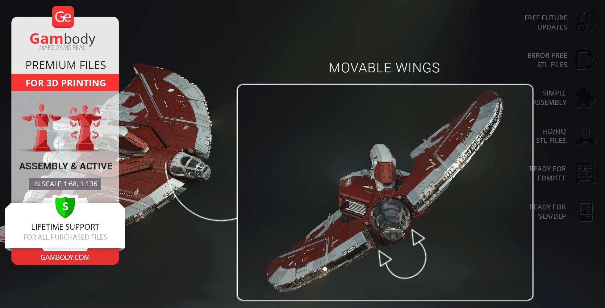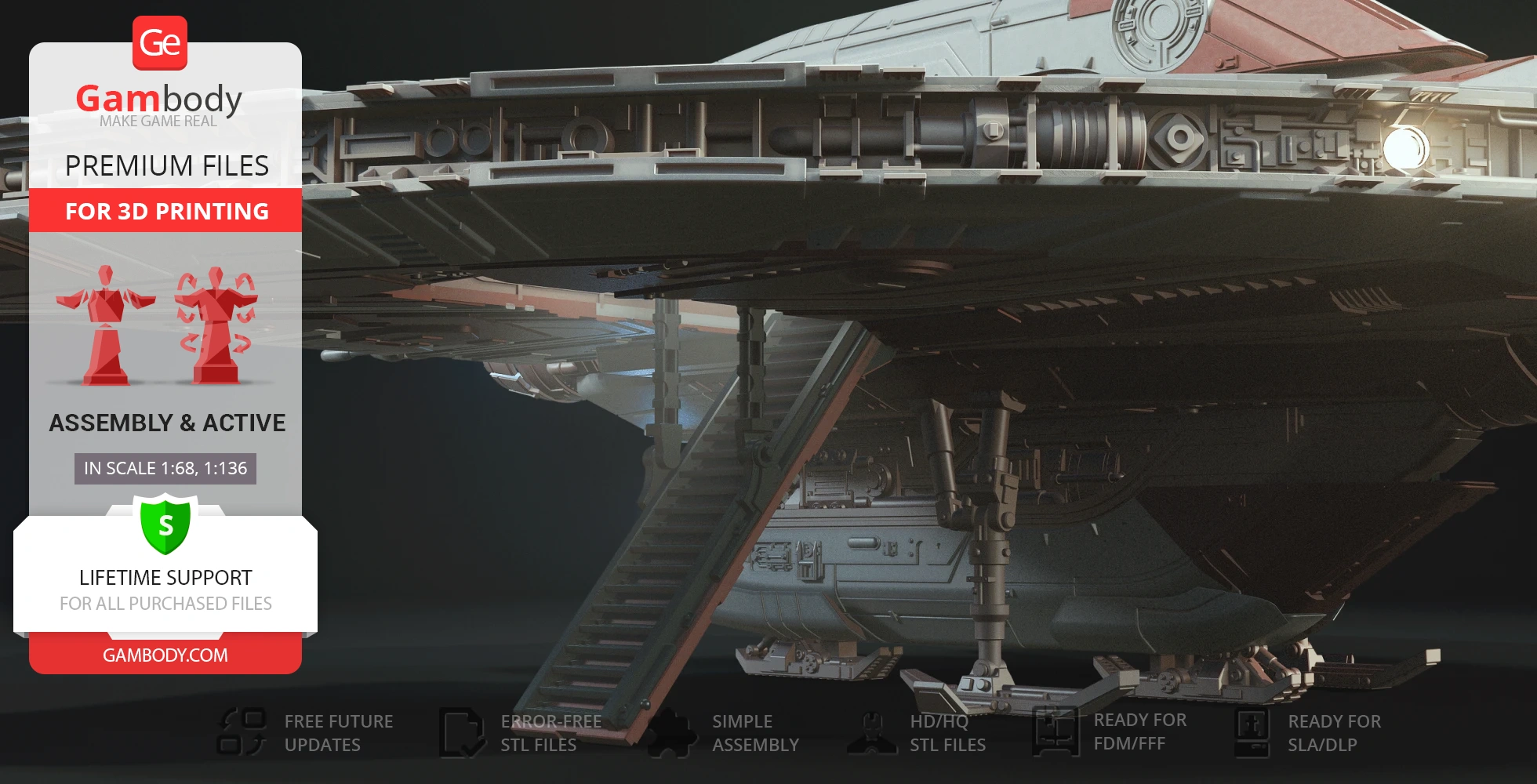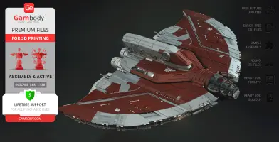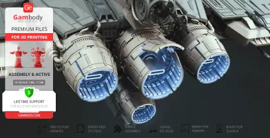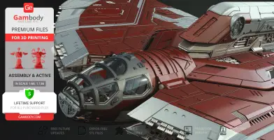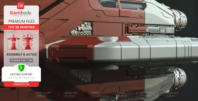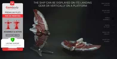 Created by our talented contributing artist, this model boasts numerous features for display and interaction. You can showcase this Star Wars spaceship landed in its two landing gear options or dynamically mounted vertically on a platform. Explore its movable cockpit, deploy the boarding ramp, and adjust the wings to recreate various in-flight or landed configurations. For those seeking an extra touch of realism, tunnels for LED lighting are integrated to illuminate the ship's engines, cockpit, and wings. Get your Star Wars STL files today and experience the joy of building and displaying this exceptional 3D printing design!