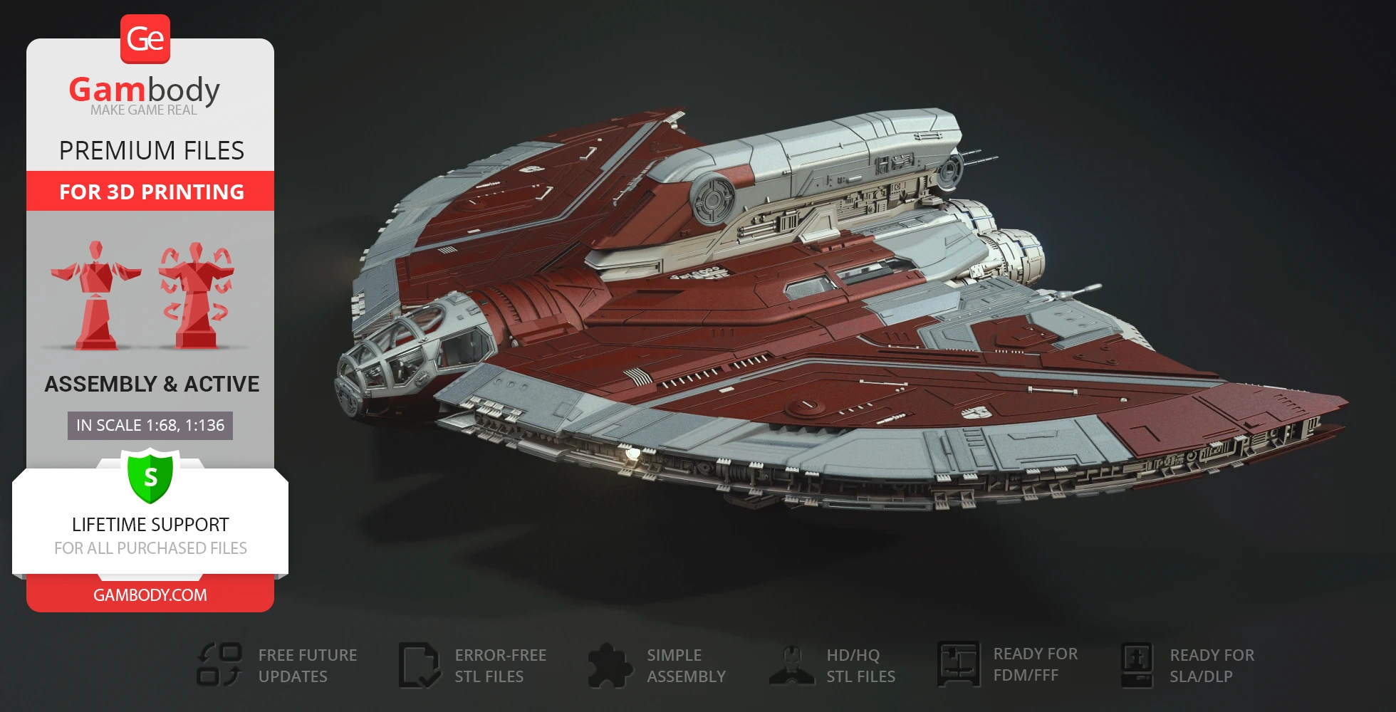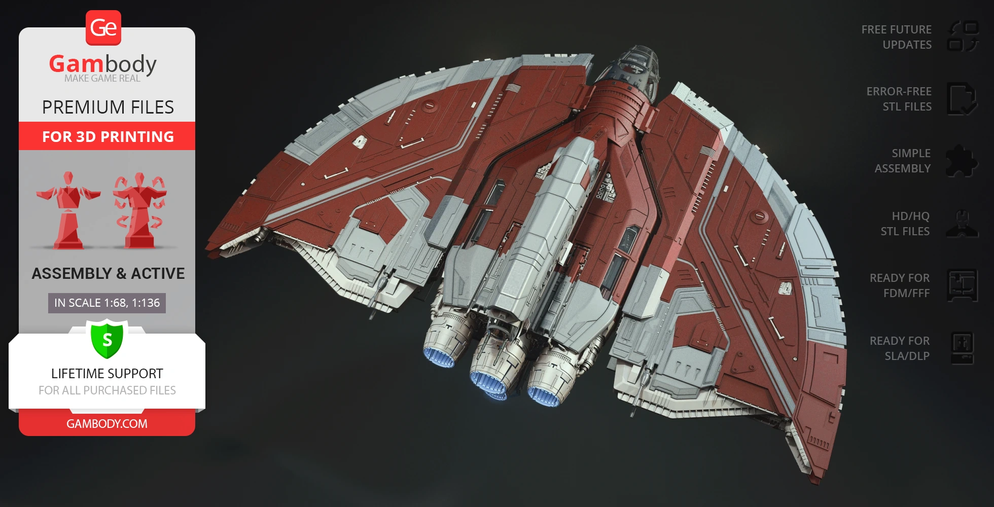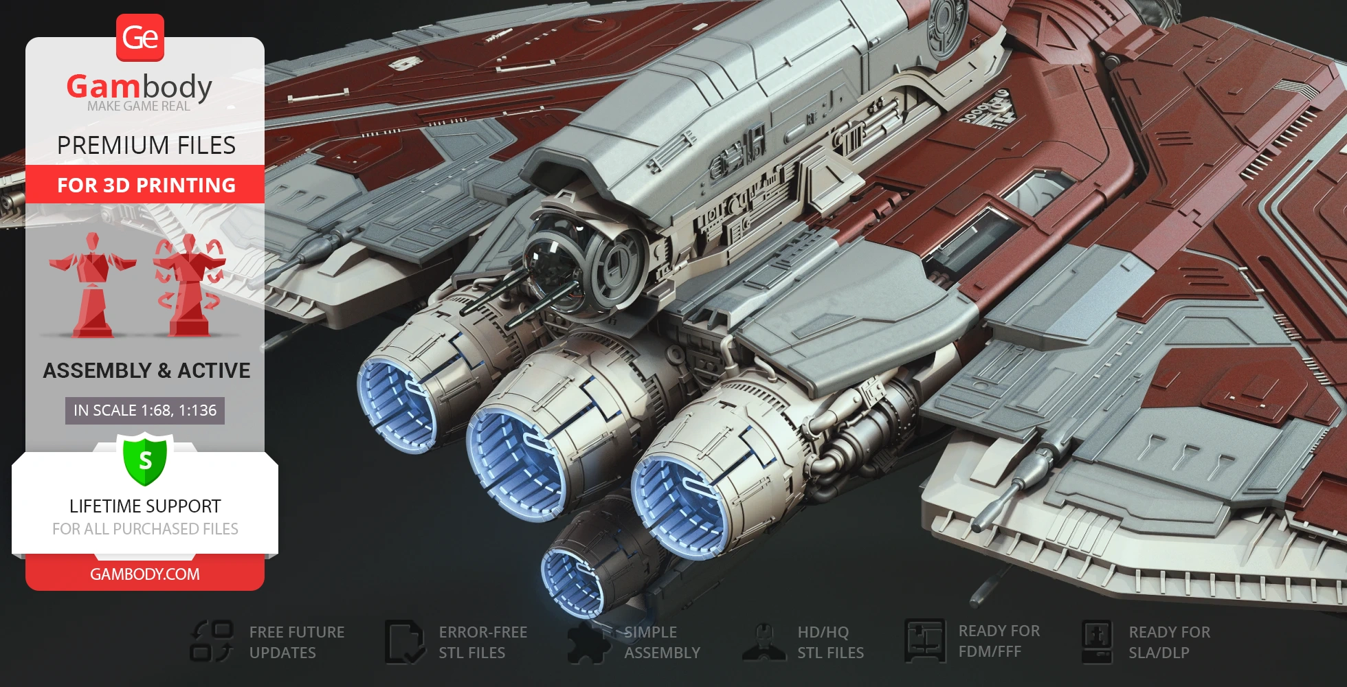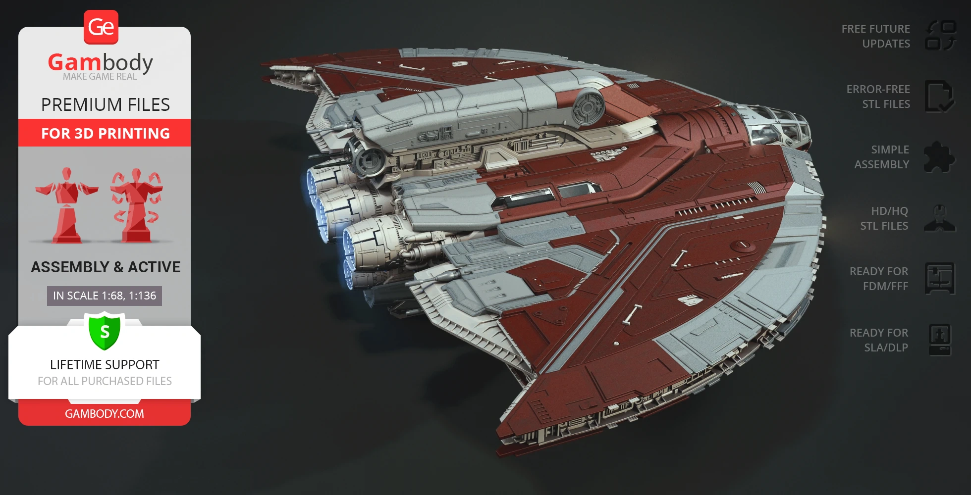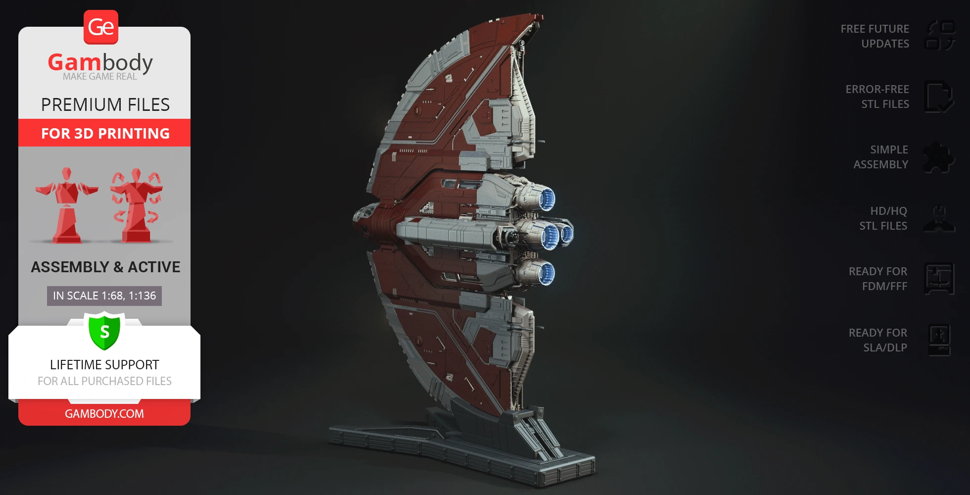 Created by our talented contributing artist, this model boasts numerous features for display and interaction. You can showcase this Star Wars spaceship landed in its two landing gear options or dynamically mounted vertically on a platform. Explore its movable cockpit, deploy the boarding ramp, and adjust the wings to recreate various in-flight or landed configurations. For those seeking an extra touch of realism, tunnels for LED lighting are integrated to illuminate the ship's engines, cockpit, and wings. Get your Star Wars STL files today and experience the joy of building and displaying this exceptional 3D printing design!