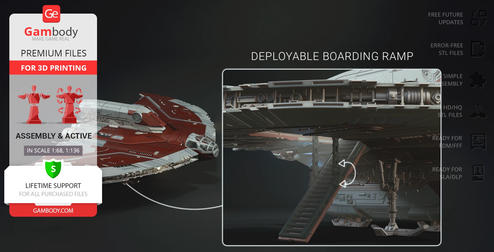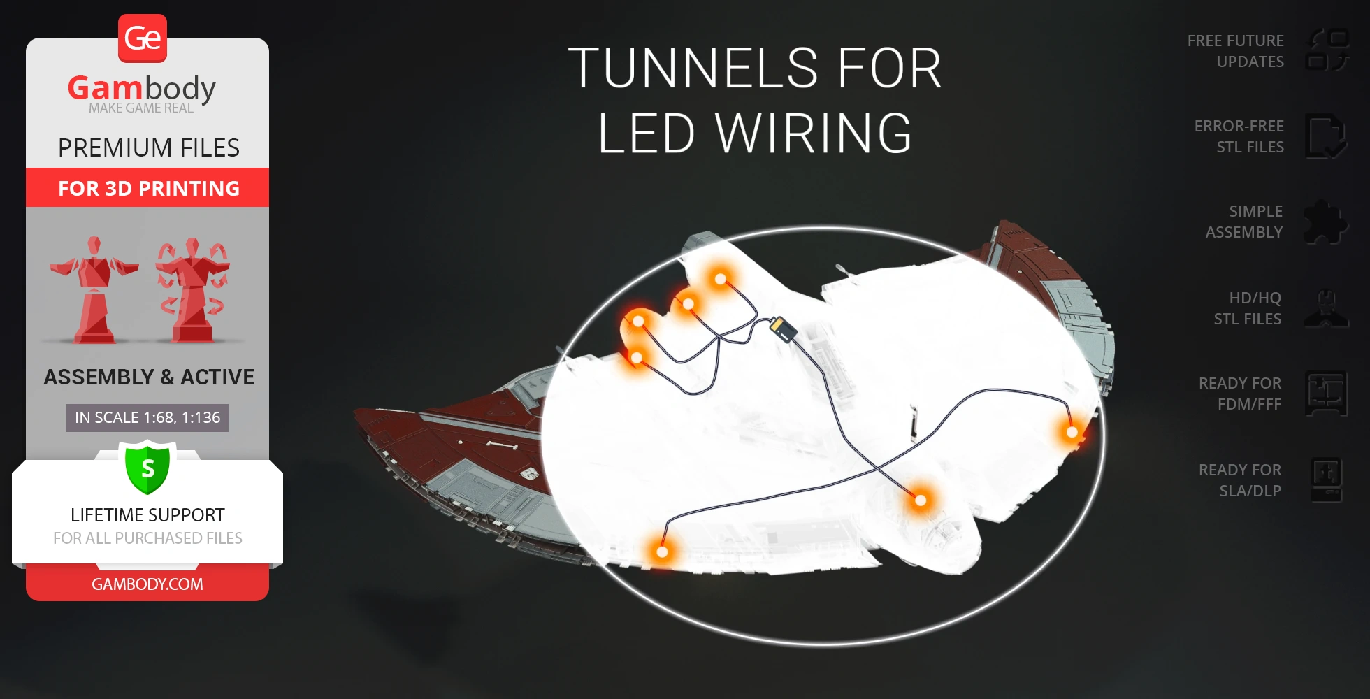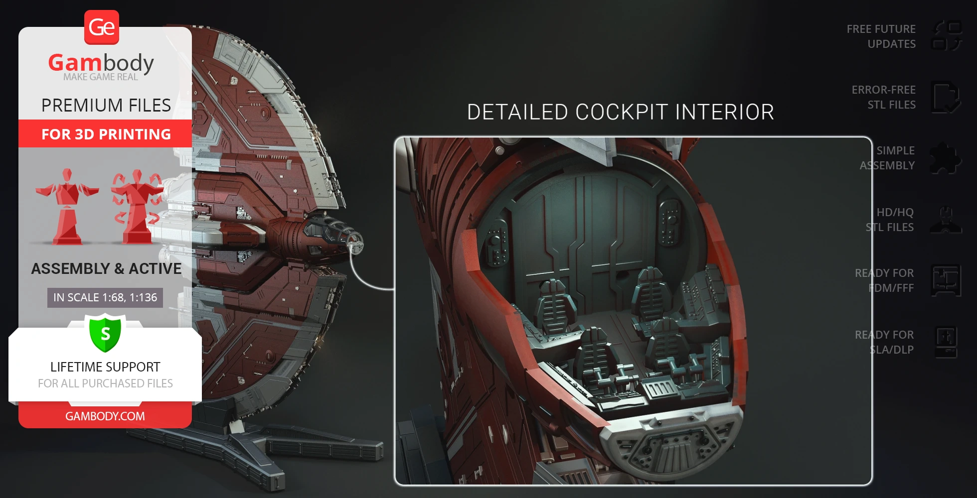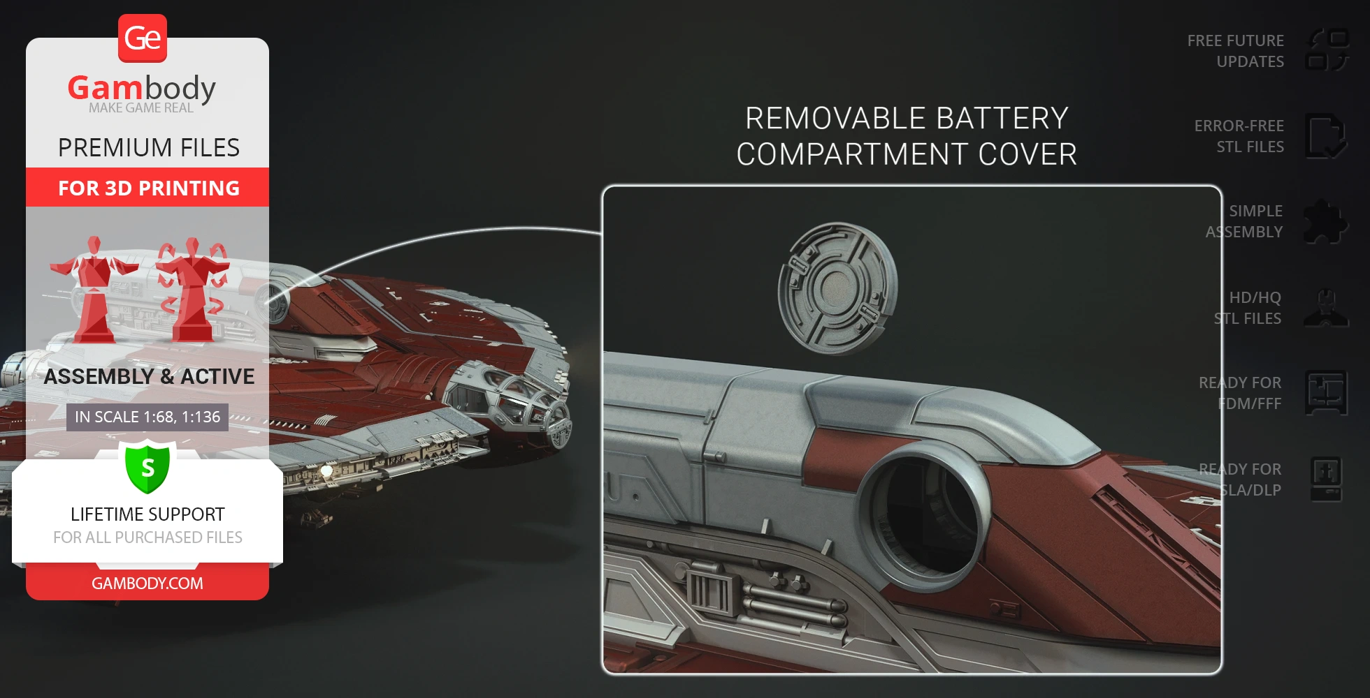 Created by our talented contributing artist, this model boasts numerous features for display and interaction. You can showcase this Star Wars spaceship landed in its two landing gear options or dynamically mounted vertically on a platform. Explore its movable cockpit, deploy the boarding ramp, and adjust the wings to recreate various in-flight or landed configurations. For those seeking an extra touch of realism, tunnels for LED lighting are integrated to illuminate the ship's engines, cockpit, and wings. Get your Star Wars STL files today and experience the joy of building and displaying this exceptional 3D printing design!