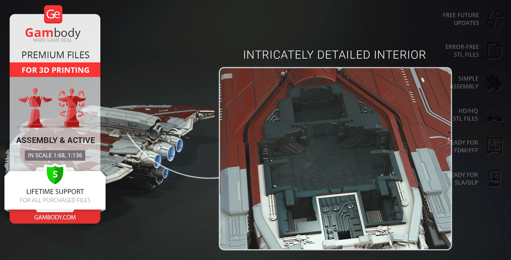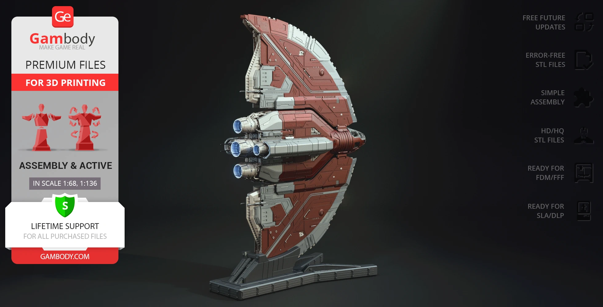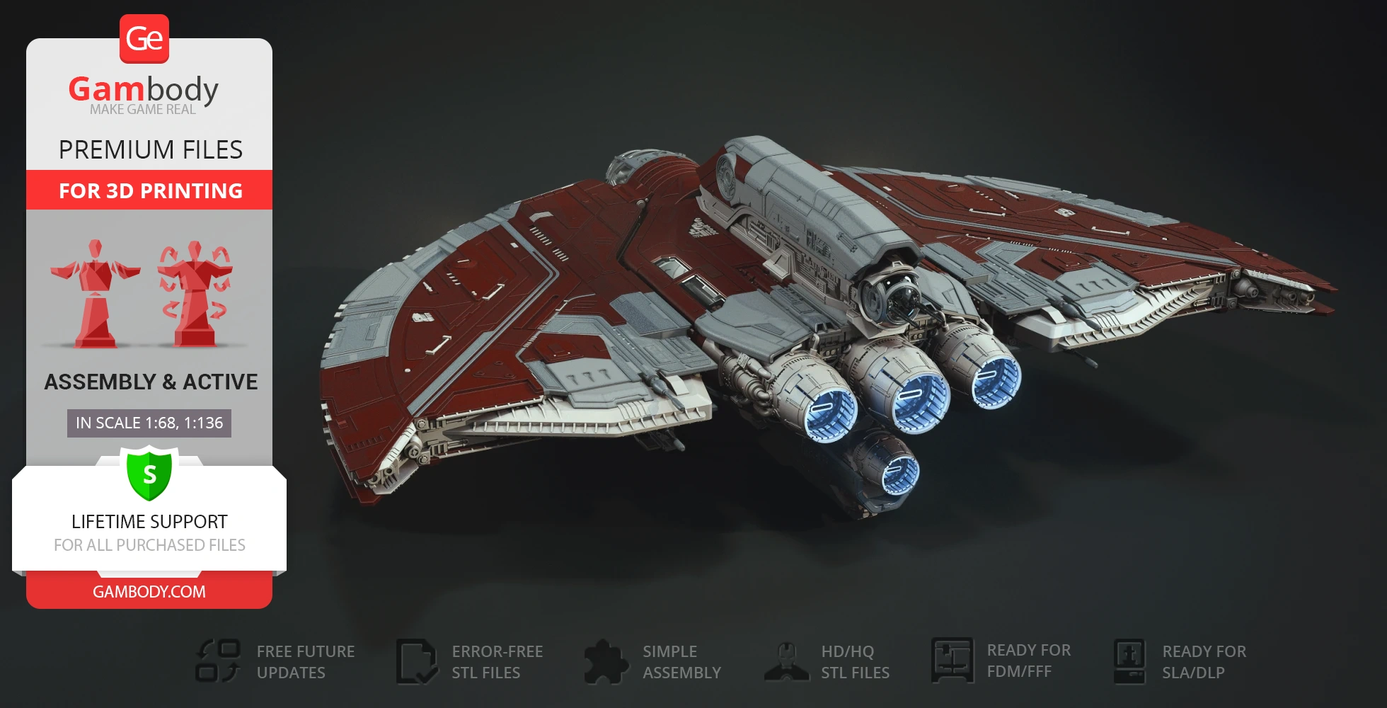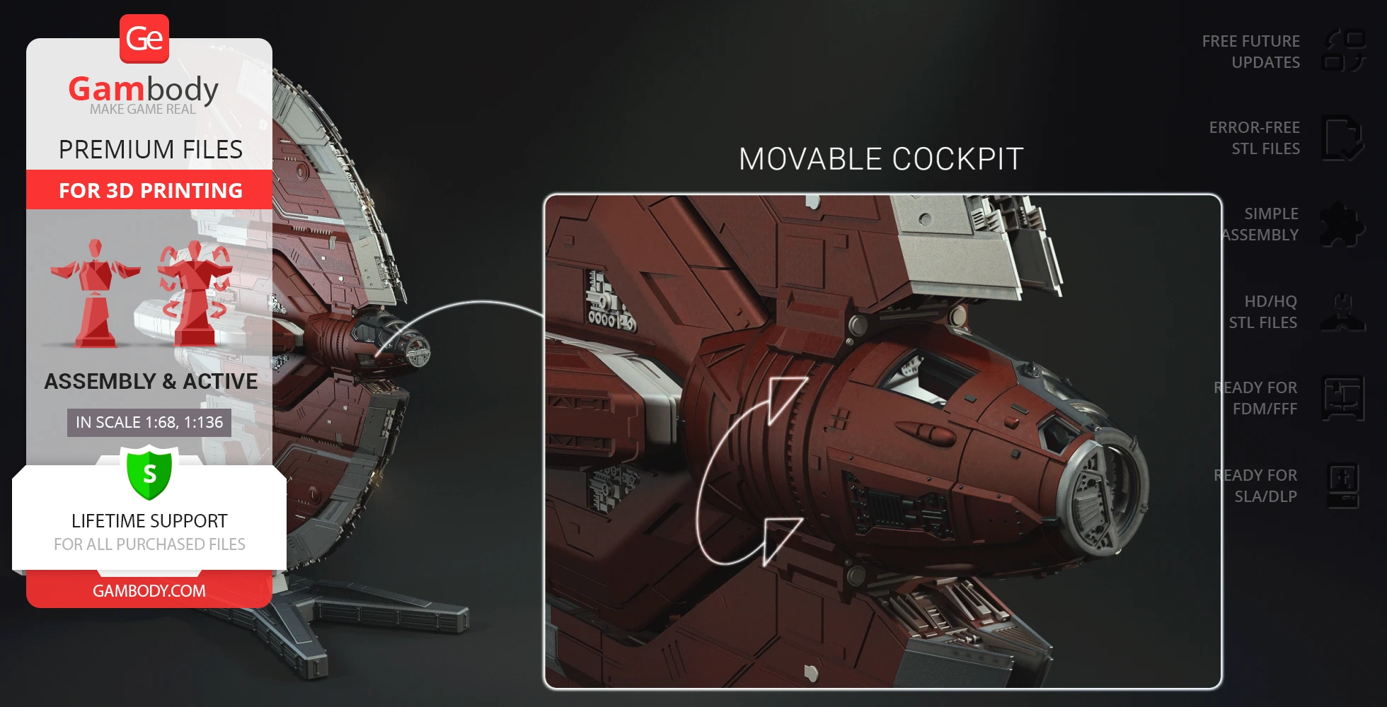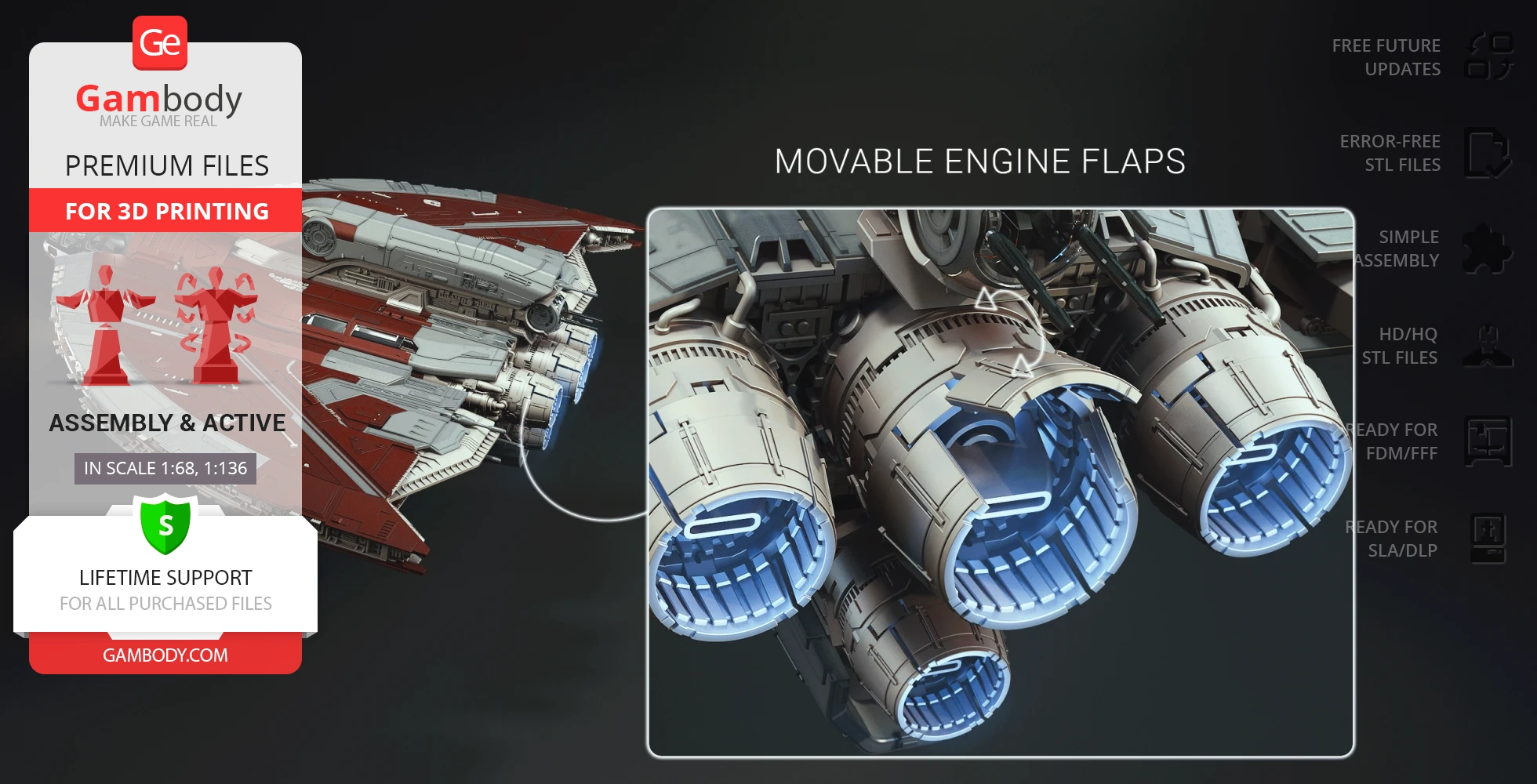Created by our talented contributing artist, this model boasts numerous features for display and interaction. You can showcase this Star Wars spaceship landed in its two landing gear options or dynamically mounted vertically on a platform. Explore its movable cockpit, deploy the boarding ramp, and adjust the wings to recreate various in-flight or landed configurations. For those seeking an extra touch of realism, tunnels for LED lighting are integrated to illuminate the ship's engines, cockpit, and wings. Get your Star Wars STL files today and experience the joy of building and displaying this exceptional 3D printing design!