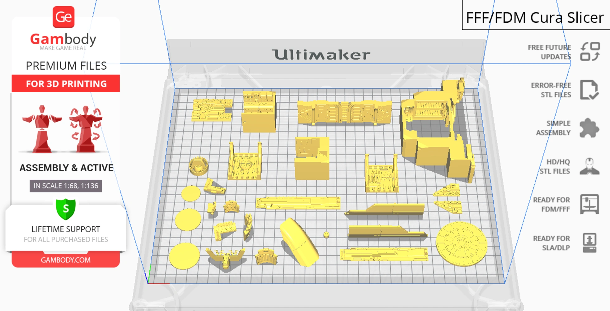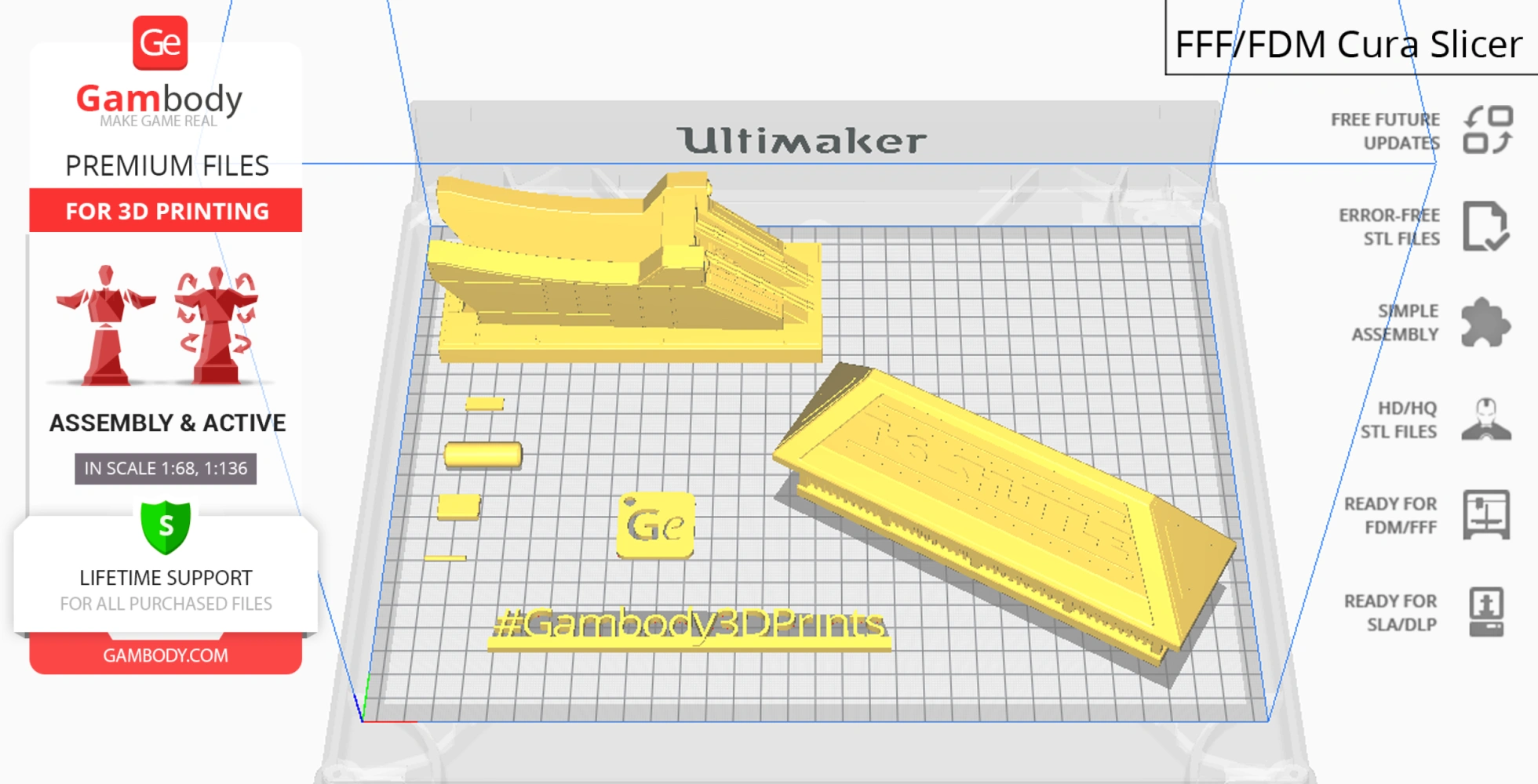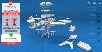 For you to receive the cleanest 3D printing result possible, minimize the amount of filament needed for generated support, and make use of the active elements designed by Gambody Engineers, the spacecraft was divided into convenient assembly parts.