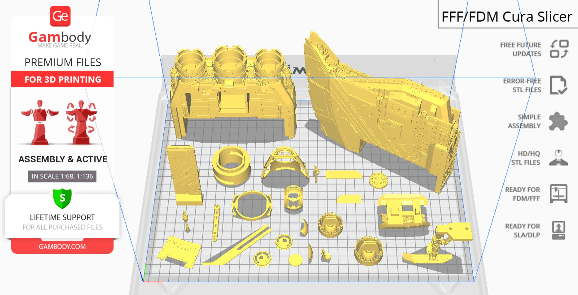 All assembly parts in the 1.0 FFF/FDM version are provided in STL files in recommended positions that were worked out in order to ensure the smoothness of the details’ surfaces after printing and that the 3D printing beginners won’t face difficulties when placing the parts on a build plate. When downloading any model’s file you will also receive “Assembly Manual” for 1.0 FFF/FDM and 1.0 DLP/SLA versions in PDF and video formats. We highly recommend that you get acquainted with the “Assembly Video” and “Assembly Manual” before getting down to the T-6 Jedi Shuttle.