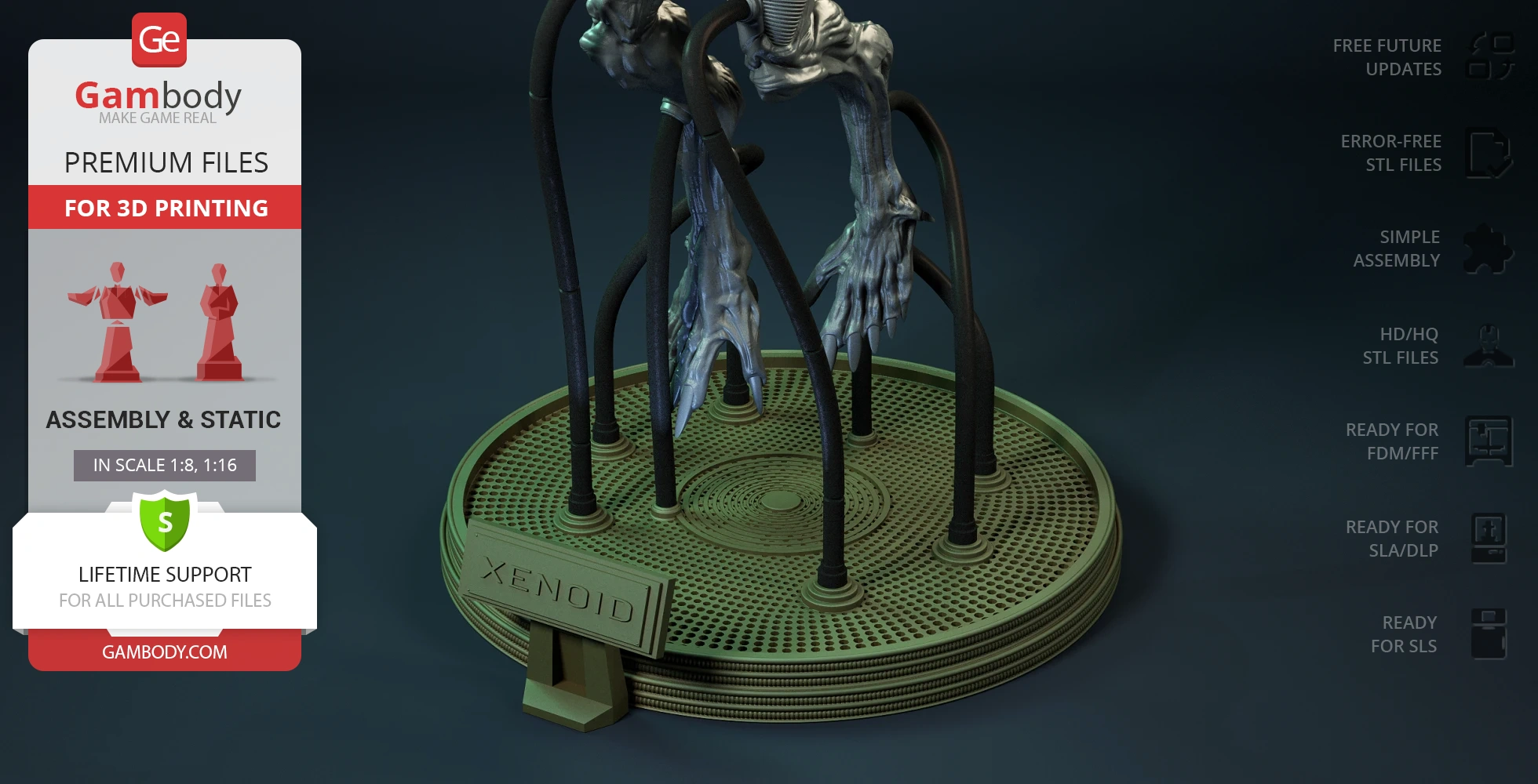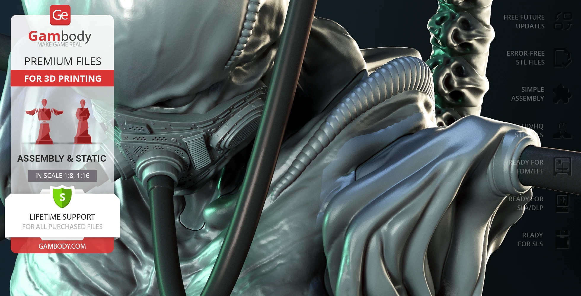 - STL files of high-poly Xenomorph in Incubator model for 3D printing consist of 84 files;