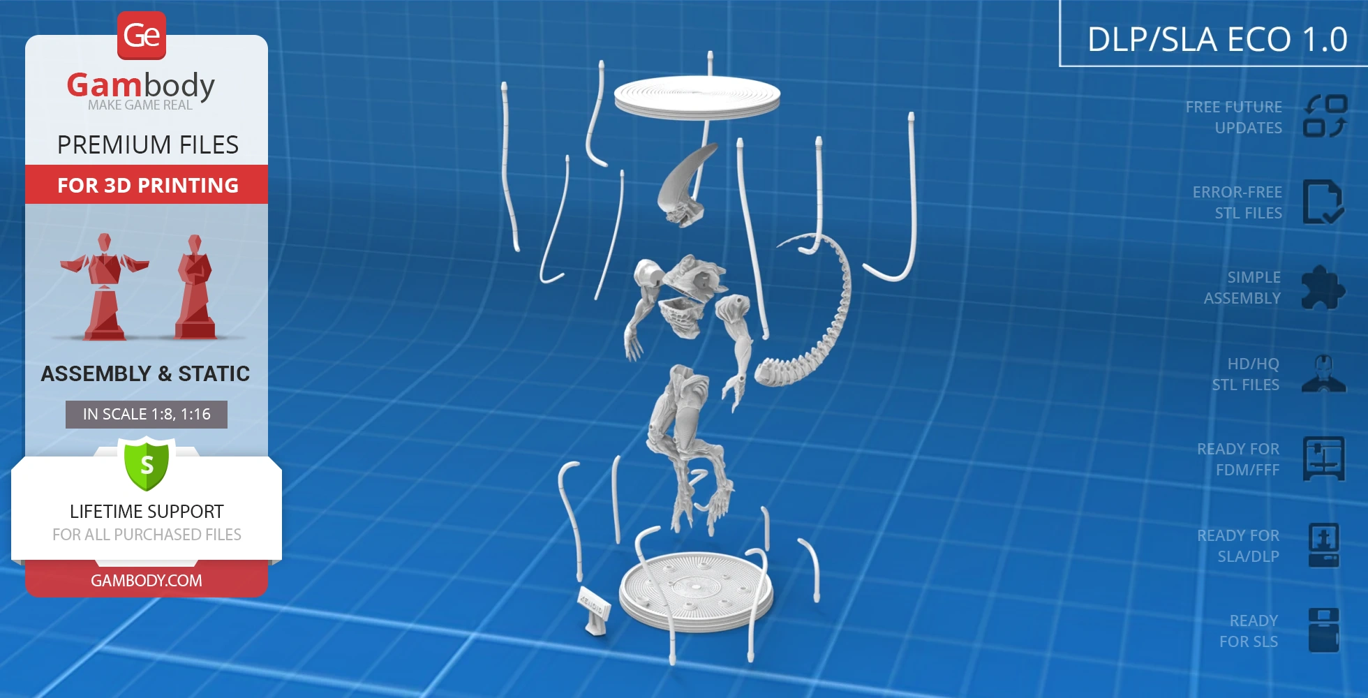 - 4 versions of Xenomorph in Incubator STL files for FFF/FDM, DLP/SLA, DLP/SLA Eco, and SLS — files for all versions are available for download after the purchase;