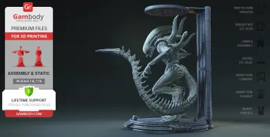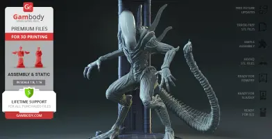 Alien in Chamber is a static assembly figurine and its moderation and adaptation for different types of 3D printers took Gambody team 52 hours in total. The figurine’s anatomy and proportions were thoroughly reviewed during the moderation process for the extraterrestrial creature to be depicted harmoniously the intended pose. The model’s cutting was chosen by our team to minimise the amount of filament needed for generated support and some of the parts were hollowed out for you to save resin in the figurine’s Eco version. In order to conceal the places where the assembly parts of the model must be connected, the figurine was cut along the anatomic folds of the alien’s exoskeleton. For you to achieve the cleanest 3D printed result, Alien’s head, its tongue, various sets of dorsal tubes, the spiky tail, etc. are provided as separate assembly parts. The base of the model is optional - you may display the Xenomorph as if inside the toxic chamber or on a simple stylised base. All assembly parts are provided in STL files in recommended positions that were worked out so to ensure the smoothness of the details’ surfaces after printing and that the 3D printing beginners won't face difficulties when placing the parts on a build plate. When downloading any figurine's file you will also receive "Assembly Manual" for FFF/FDM 1.0 and DLP/SLA 1.0 versions in PDF format.
