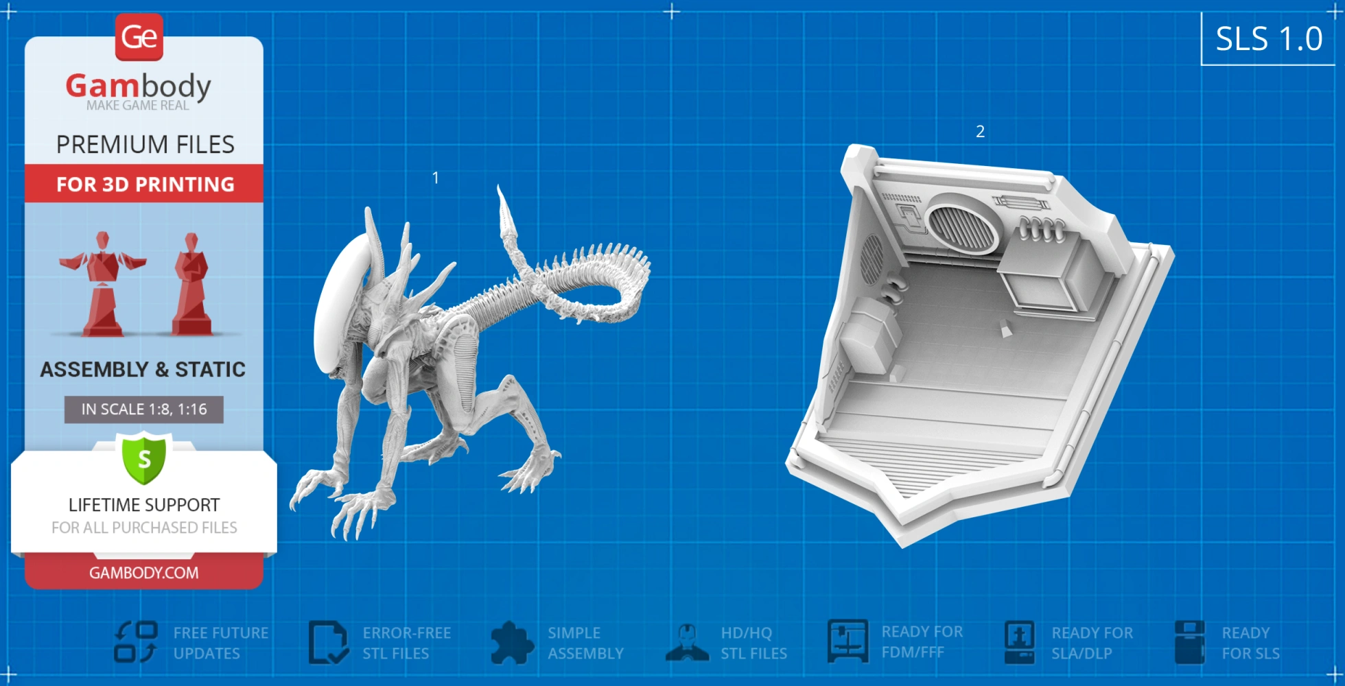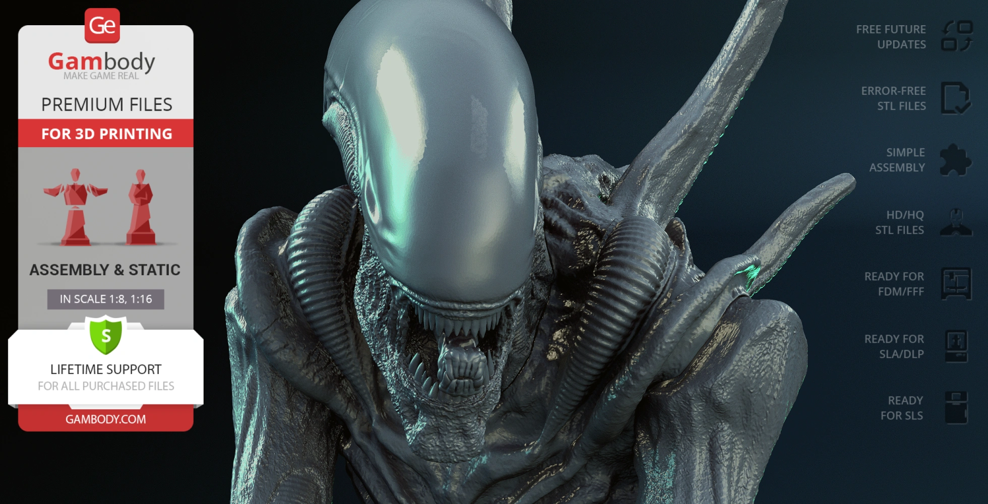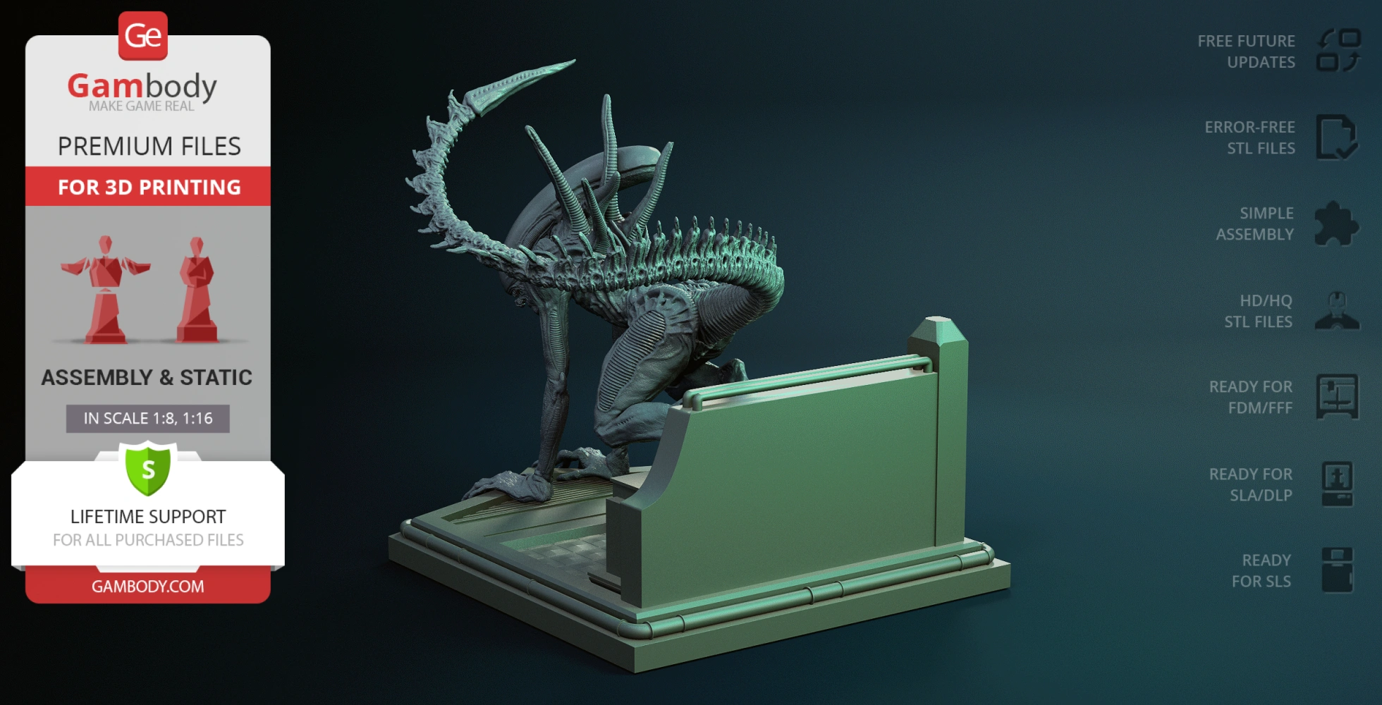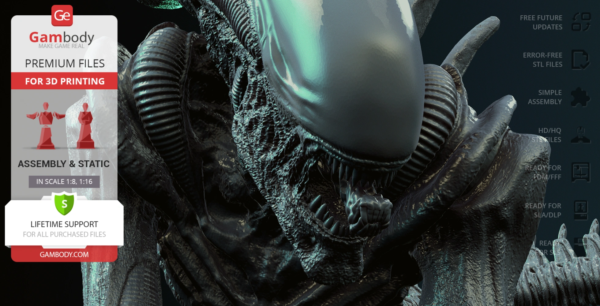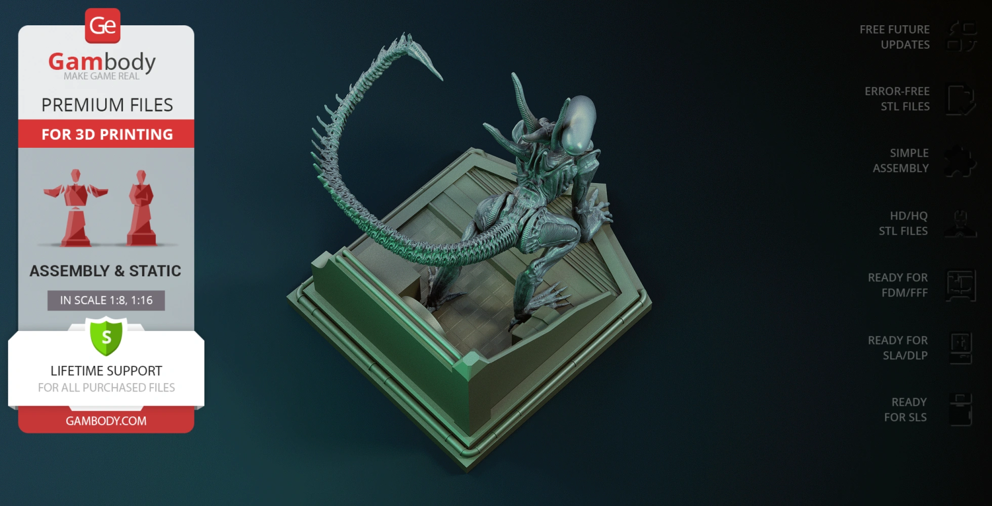 • 4 versions of Xenomorph Sewer Escape STL files for FFF/FDM, DLP/SLA, DLP/SLA Eco, and SLS files for all versions are available for download after the purchase;