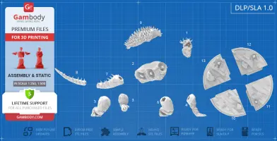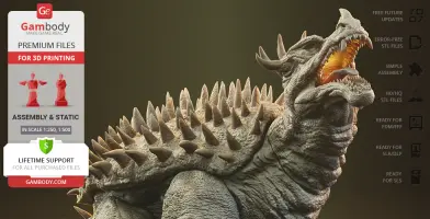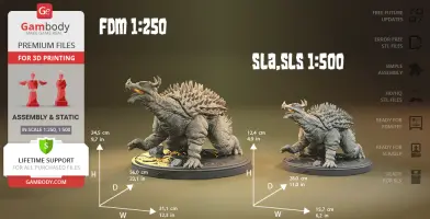Anguirus is a static assembly figurine and its moderation and adaptation for different types of 3D printers took Gambody team 52 hours in total. The huge figurine in its assembly version was divided into as many assembly parts as needed to fit even the smallest 3D printers' build plates and for you to nevertheless receive a giant 3D printed kaiju after assembly. The cutting of Anguirus figurine was chosen by our team to minimise the amount of filament needed for generated support and some of the model’s parts were hollowed out for you to save resin in the model’s Eco version. For you to achieve the cleanest 3D printed result, kaiju’s feet, long spiky tail, carapace, etc. are provided as separate assembly pieces. For the same purpose, the monster’s tongue and upper jaw were extracted from the mouth and are now provided as two separate parts. A lot of bigger spikes on Anguirus’ tail and the horns on the head have also been separated. The model’s rocky platform was divided into four parts to fit the build plates of the average 3D printers. All assembly parts are provided in STL files in recommended positions that were worked out so to ensure the smoothness of the details’ surfaces after printing and that the 3D printing beginners won't face difficulties when placing the parts on a build plate. When downloading any figurine's file you will also receive "Assembly Manual" for FFF/FDM 1.0 and DLP/SLA 1.0 versions in PDF format.