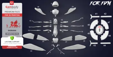 There are 49 parts for FFF/FDM version, 24 parts for DLP/SLA version and 3 parts for SLS.