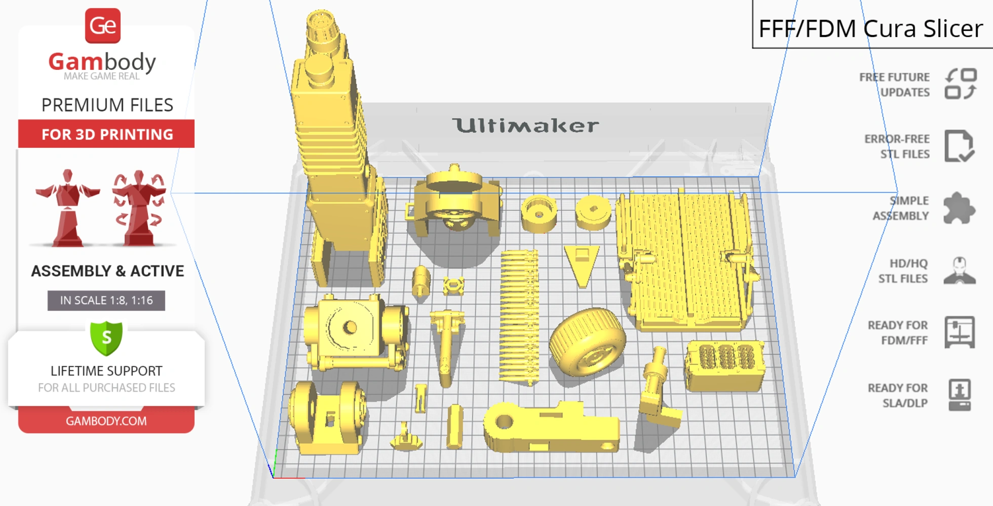 The model is optimized for 3D printing on DLP/SLA printers using resin as the material. Usually, it is at a smaller scale and consists of fewer parts to save resin and maintain fine details. Some models may also come in an ECO version - with hollowed-out parts to further reduce resin consumption.