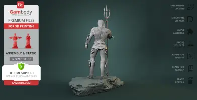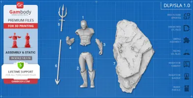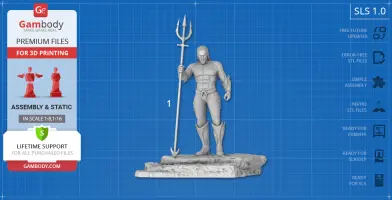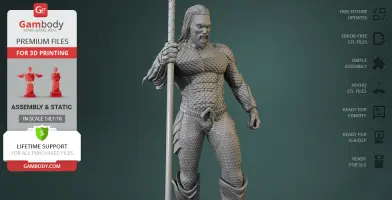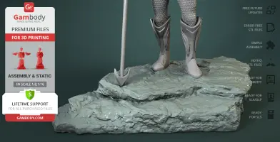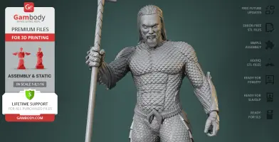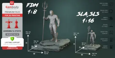 Scale: Aquaman King of Atlantis actual height is 1930 mm. The model’s chosen scale is 1/8 for the FDM version and 1/16 for the DLP/SLA/SLS version.