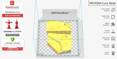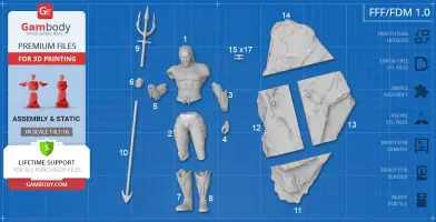 FDM version features:- Contain 15 parts;- Assembly kit includes locks. One part of Lock (15_Ge_lock_10H_x17) needs to be printed 17 times;- Made with a Trident of Neptune;- Made with a special platform styled as a part of the deep-water relief;- All parts are divided in such a way that you will print them with the smallest number of support structures.