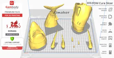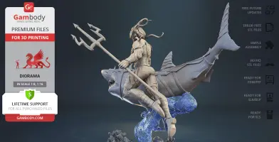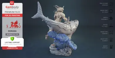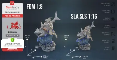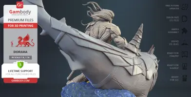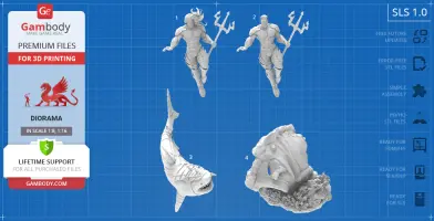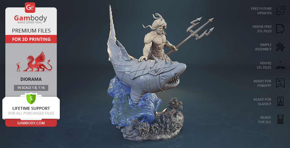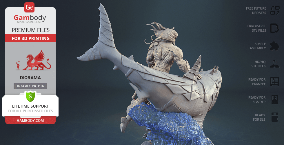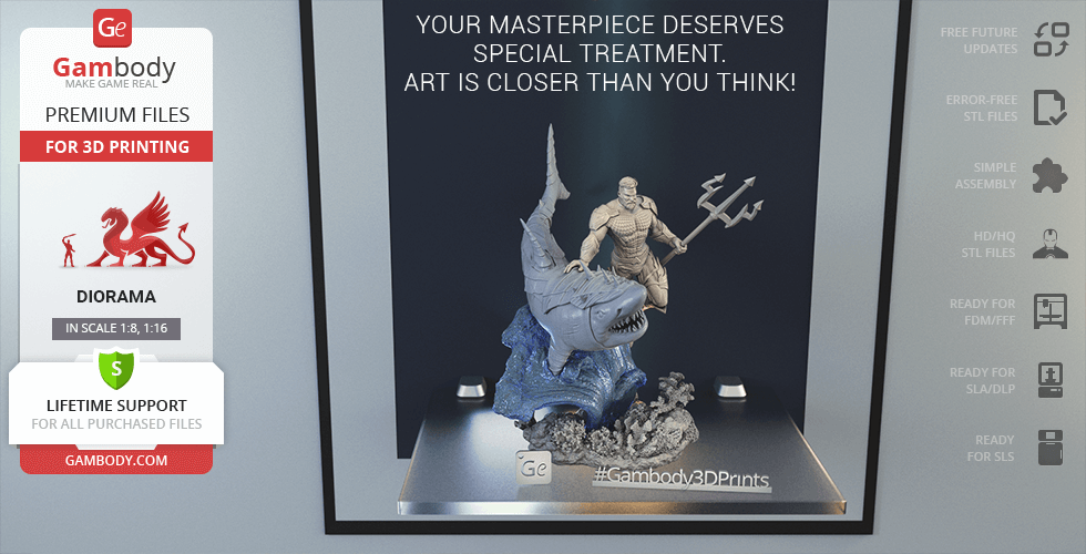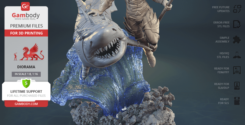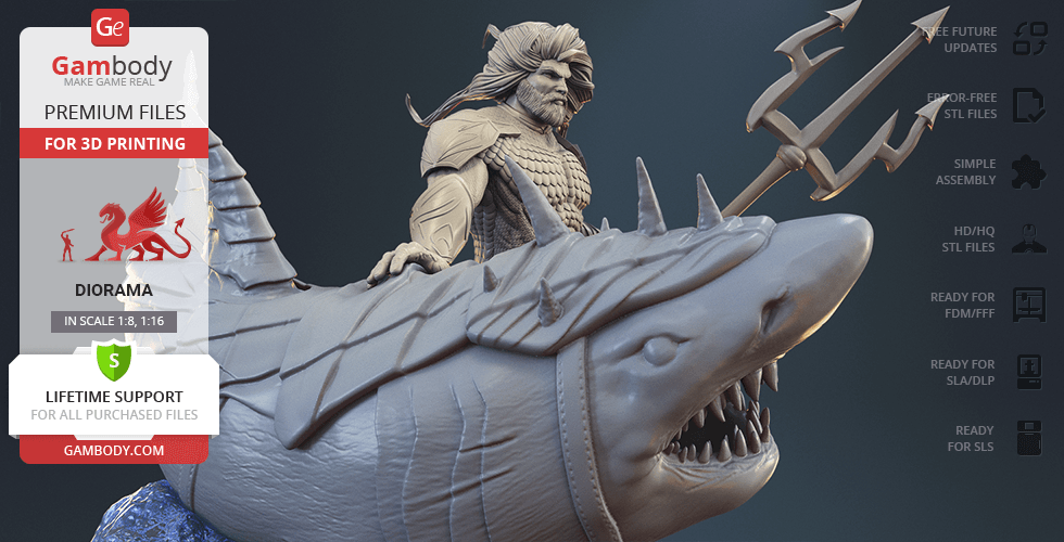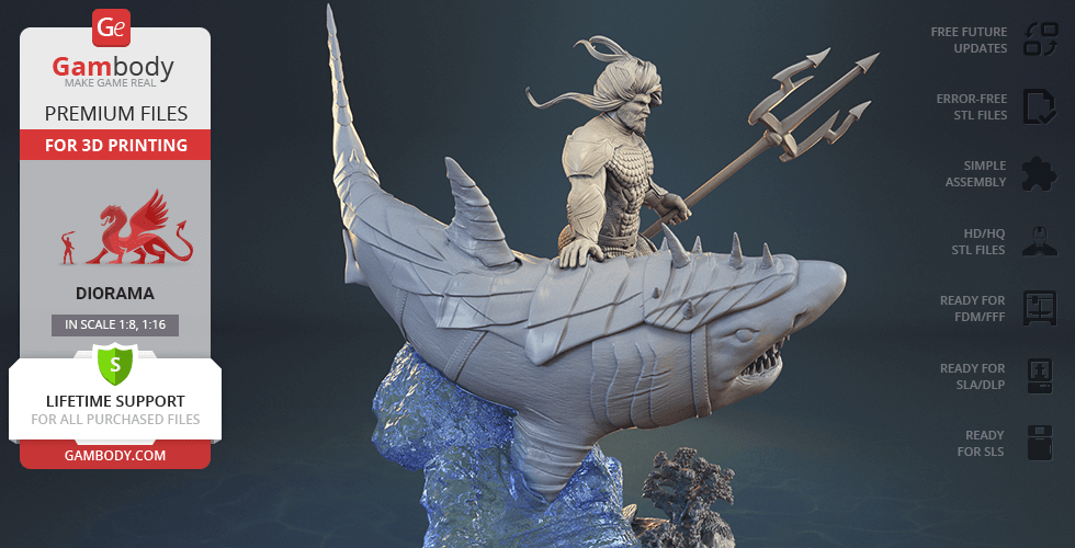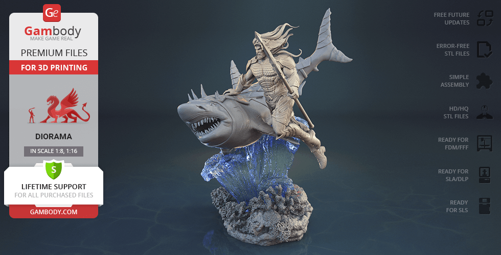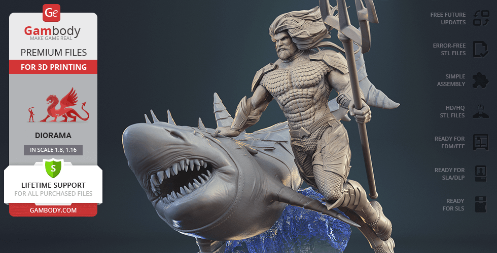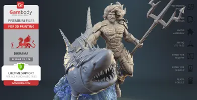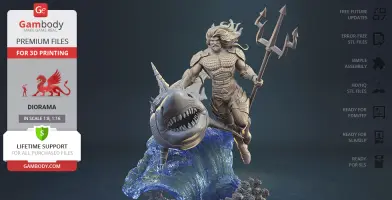 Aquaman & Shark in Diorama 3D Printer Files | Assembly includes 3 version(s) for the supported 3D printer type(s): FFF/FDM, DLP/SLA, SLS. Files are available for download after purchase.