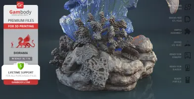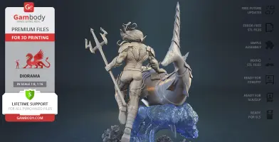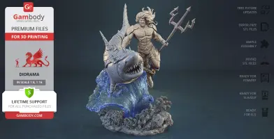 In the elaborate diorama, Aquaman is dressed in the classic green and gold Atlantean suit with scales-like plating and carries the Trident of Neptune as a symbol of his power. By the author's idea, you can choose between long luscious hair and a handsome short cut that the King of Atlantis would wear. The hero is accompanied by a sea creature, the Shark covered in protective armour in case they encounter a dangerous enemy. The diorama is upheld by the marine world itself—the burst of salty water and a beautiful coral reef that complement the scene.