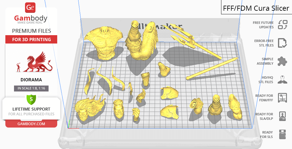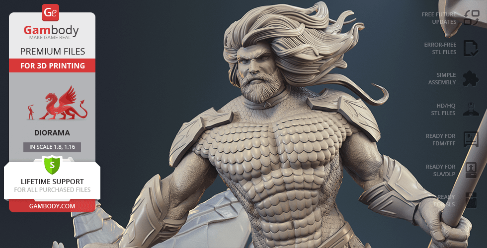 • The model is available in recommended scales of 1:8 for the FFF/FDM version and 1:16 for the DLP/SLA/SLS versions, based on approximate height of Aquaman (1930 mm).