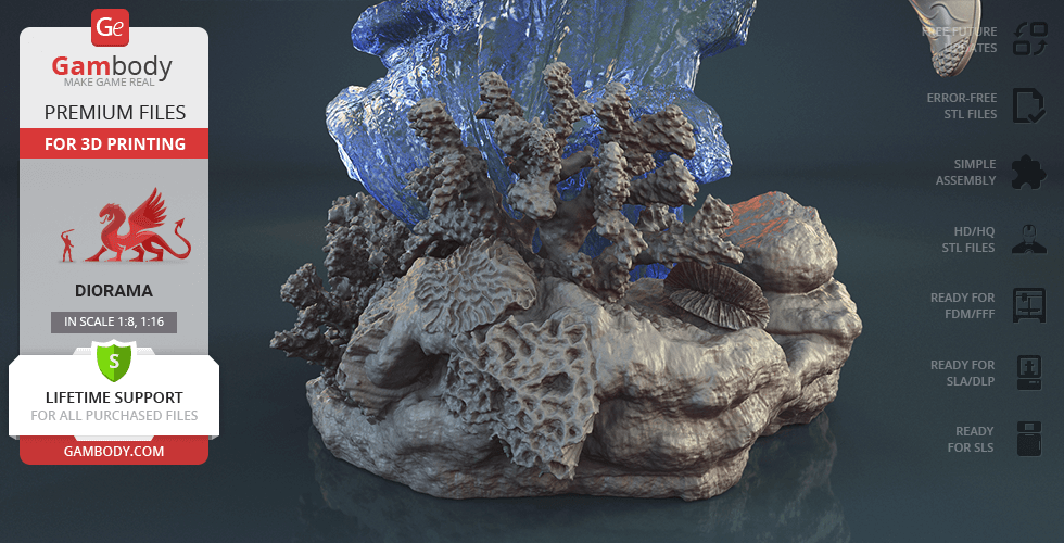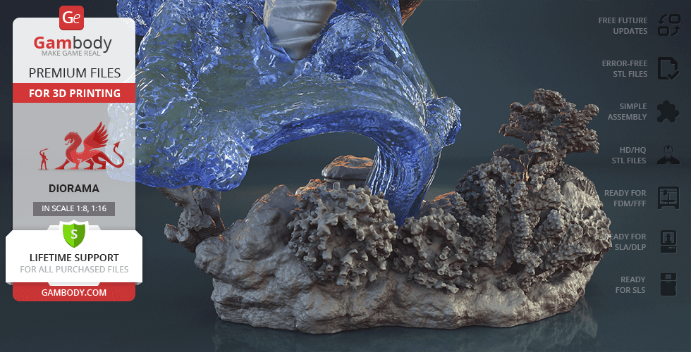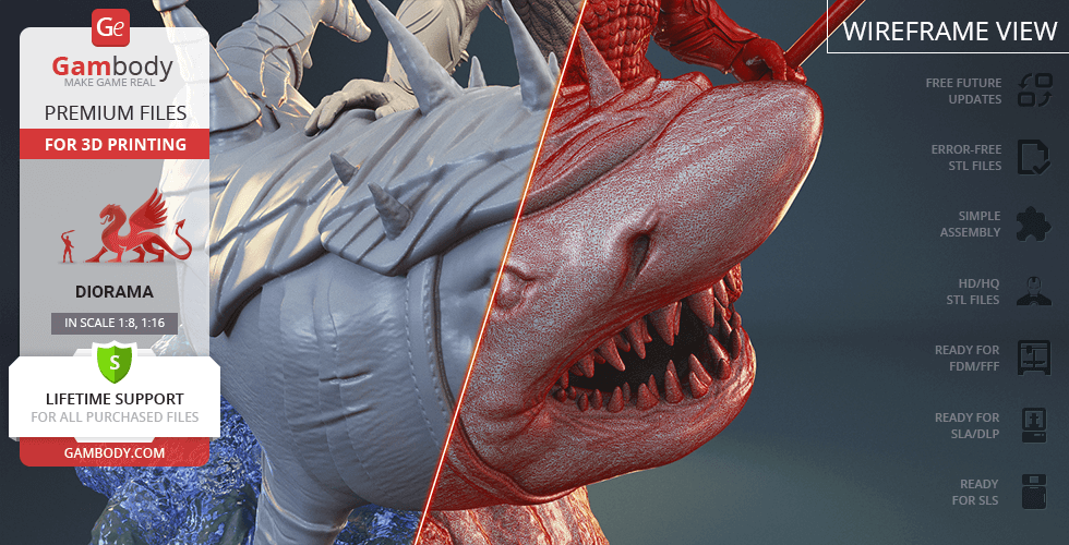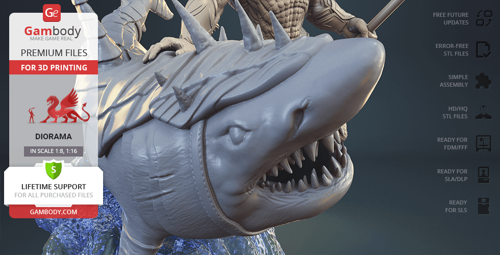 • STL files of high-poly Aquaman & Shark diorama model for 3D printing consist of 70 files;