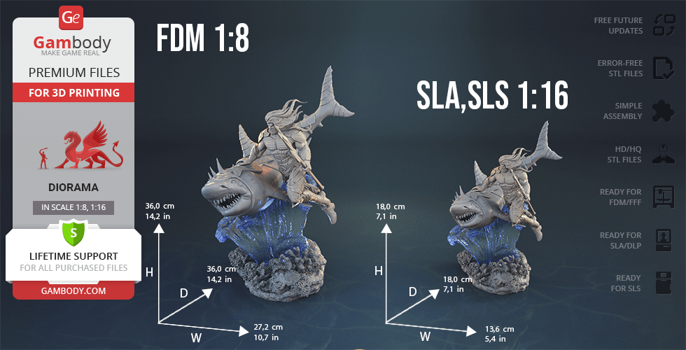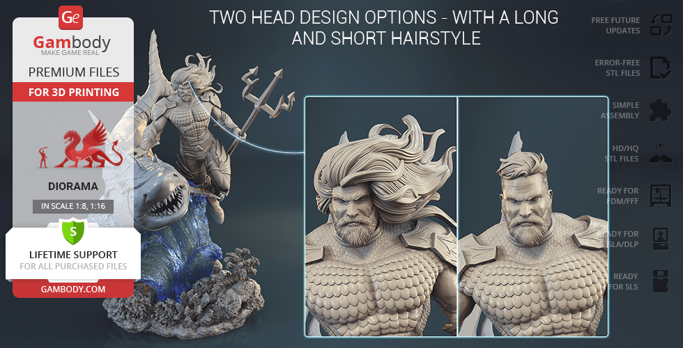 • 4 versions of Aquaman & Shark STL files for FFF/FDM, DLP/SLA, DLP/SLA Eco, and SLS files for all versions are available for download after the purchase;