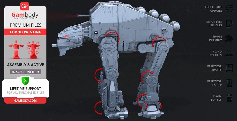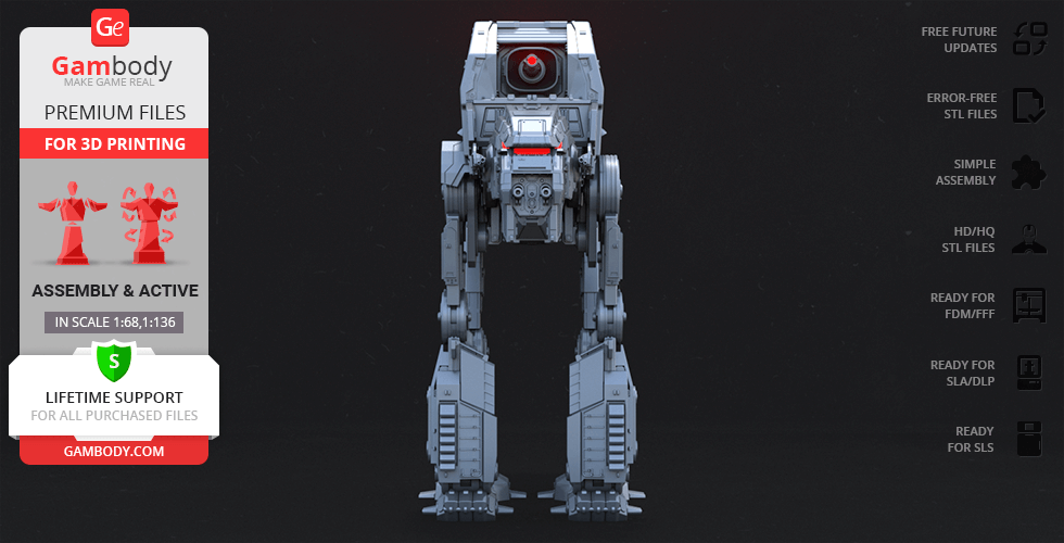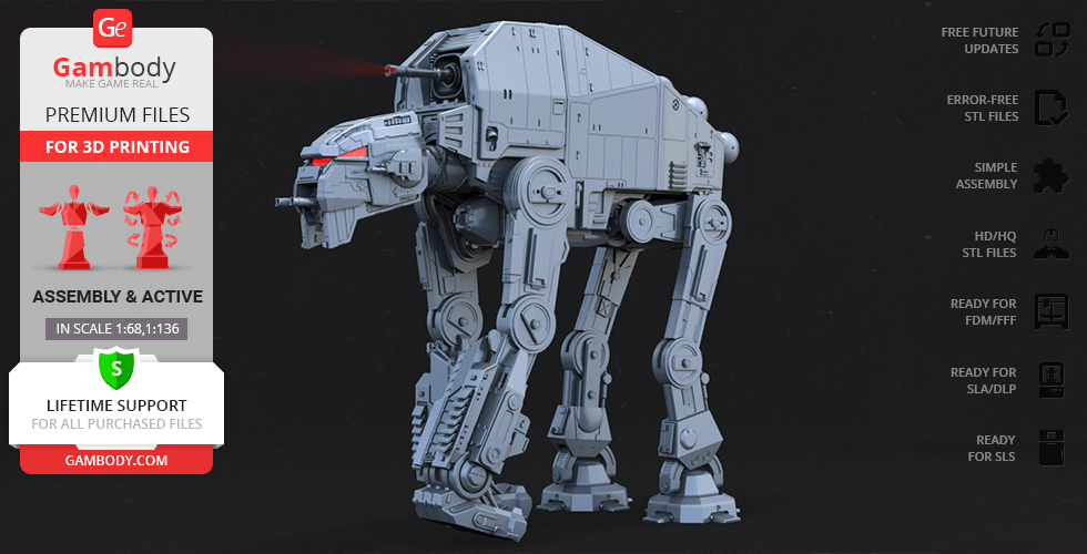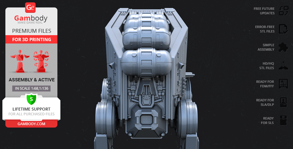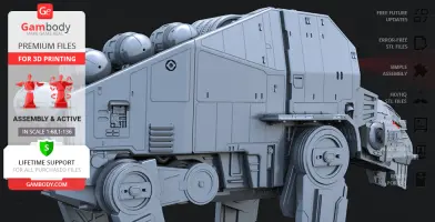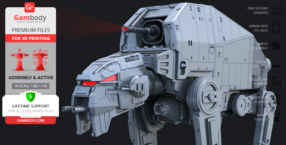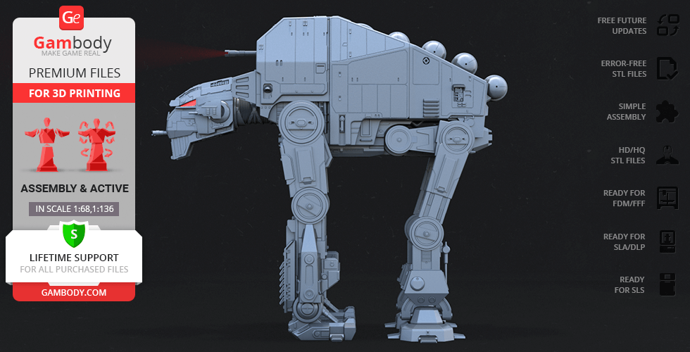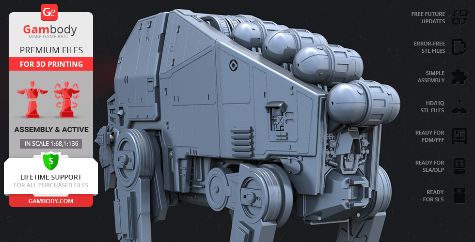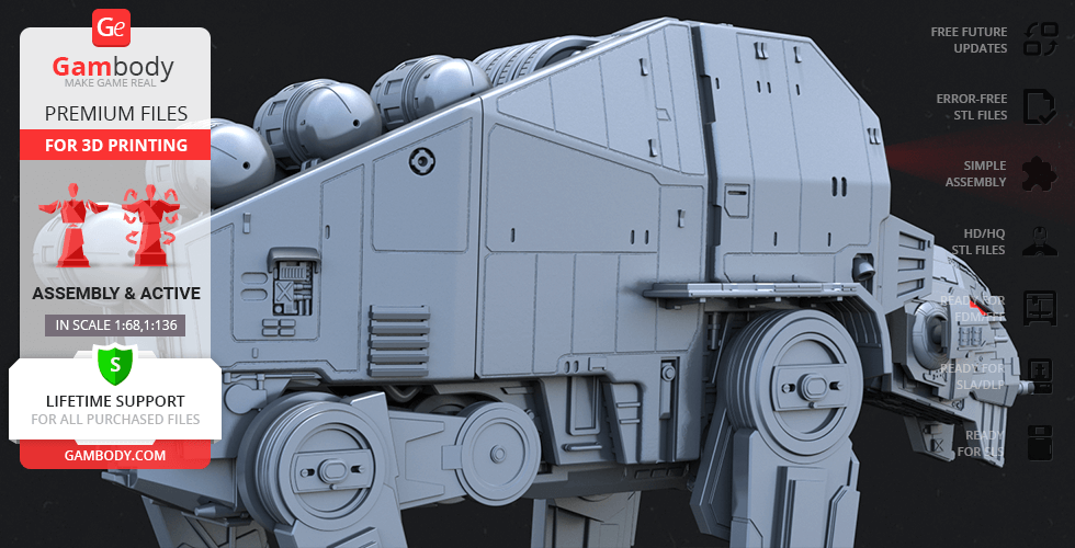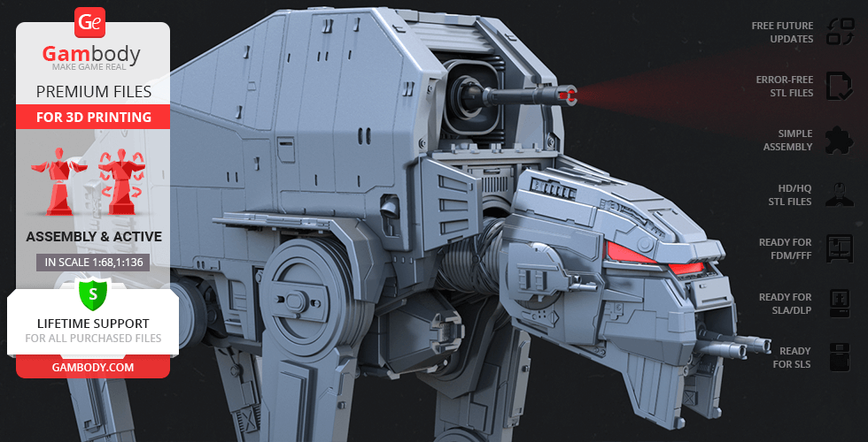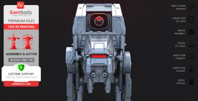AT-M6 Walker model for 3D printing is an articulated assembly model and its moderation and adaptation for different types of 3D printers took Gambody team 80 hours in total. For you to receive the cleanest printing result possible and to minimise the amount of filament needed for generated support the First Order walker model was divided into many assembly parts, e.g. chin-mounted heavy laser cannons, anti-ship laser canons, flexible armoured tunnel, the turbolaser fuel cells and the leg joints are provided as separate STL files. The connecting elements of AT-M6’s hip and knee joints were developed to ensure the legs’ articulation. Moreover, the ‘ankle drive motors’ of the rear legs were designed in such a way to ensure the footpad’s multidirectional movement. Both anti-ship laser cannons and the cockpit’s lid are movable as well. The glass cover of the cockpit is also provided as three separate files for you to print it using transparent filament. There can also be found special tunnels leading into the cockpit and MegaCaliber Six turbolaser cannon that were designed by our team for you to easily introduce LED wiring. All the assembly parts are provided in STL files in recommended positions that were worked out so to ensure the smoothness of the details’ surfaces after printing and so that the 3D printing beginners won't face difficulties when placing the parts on a build plate.