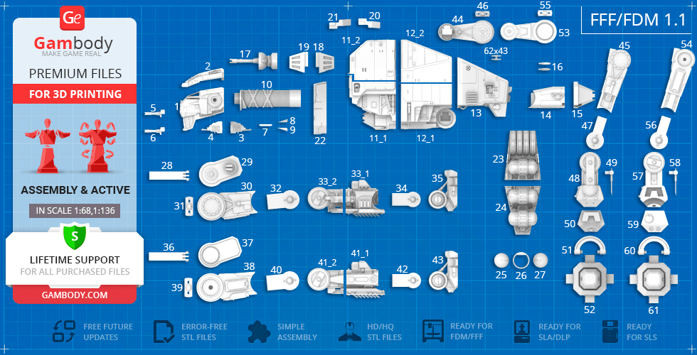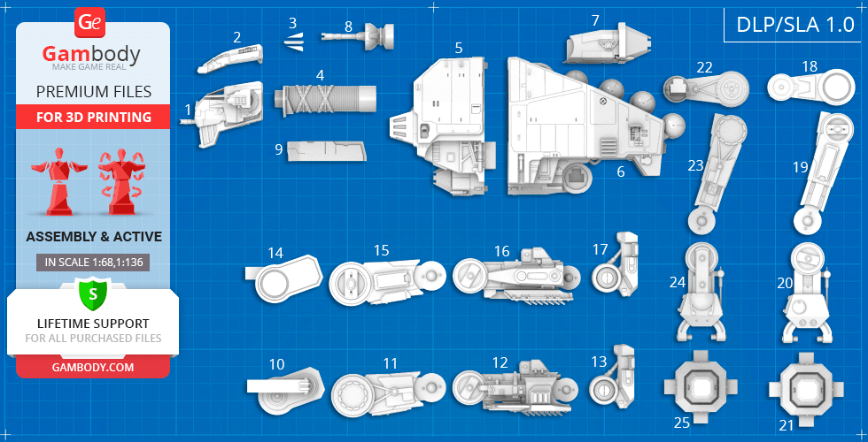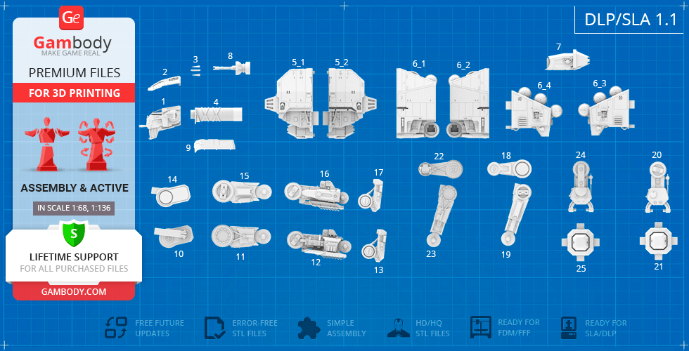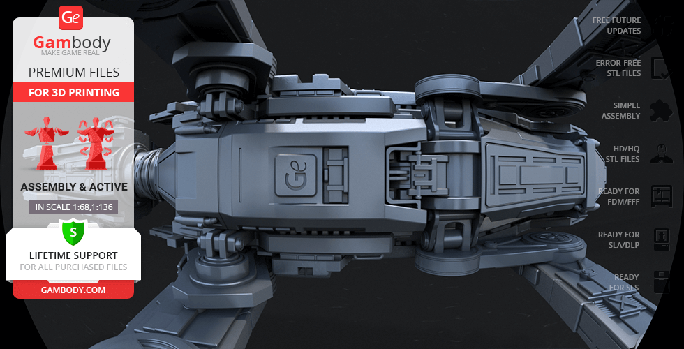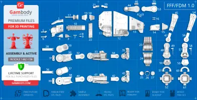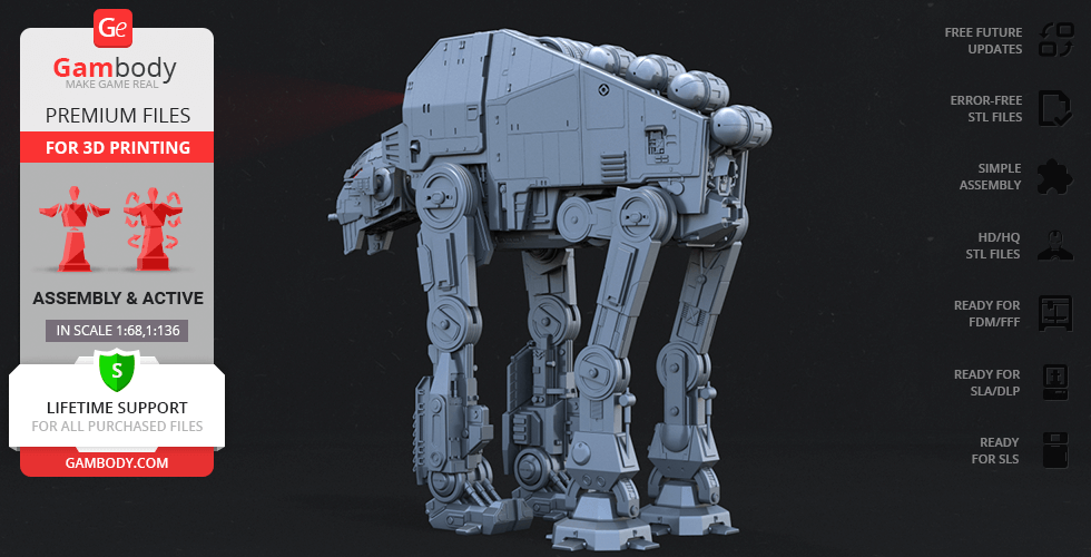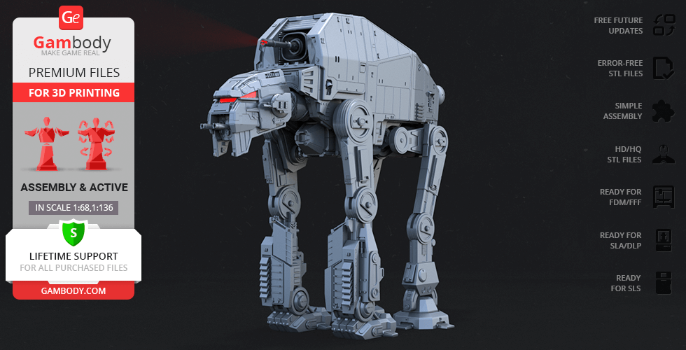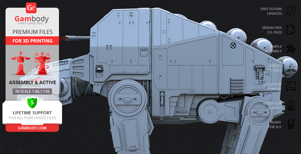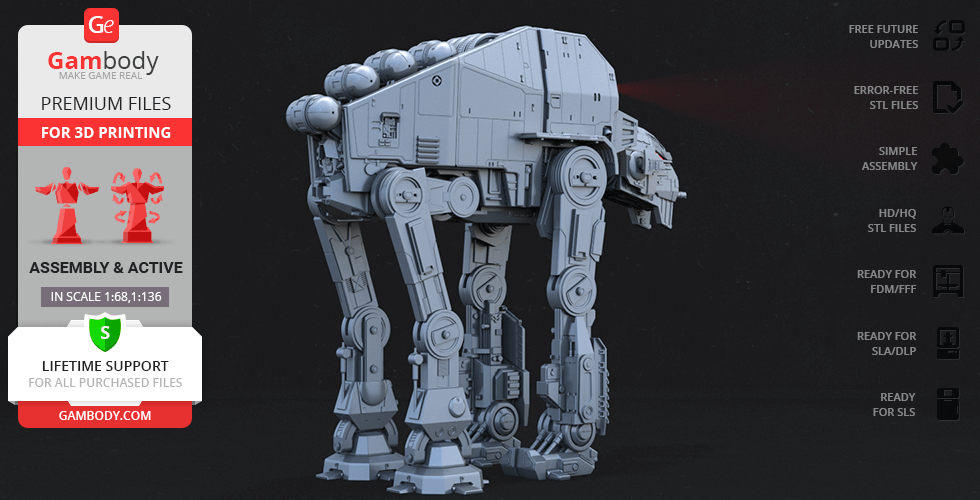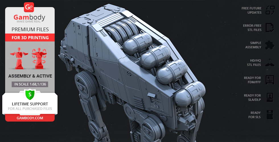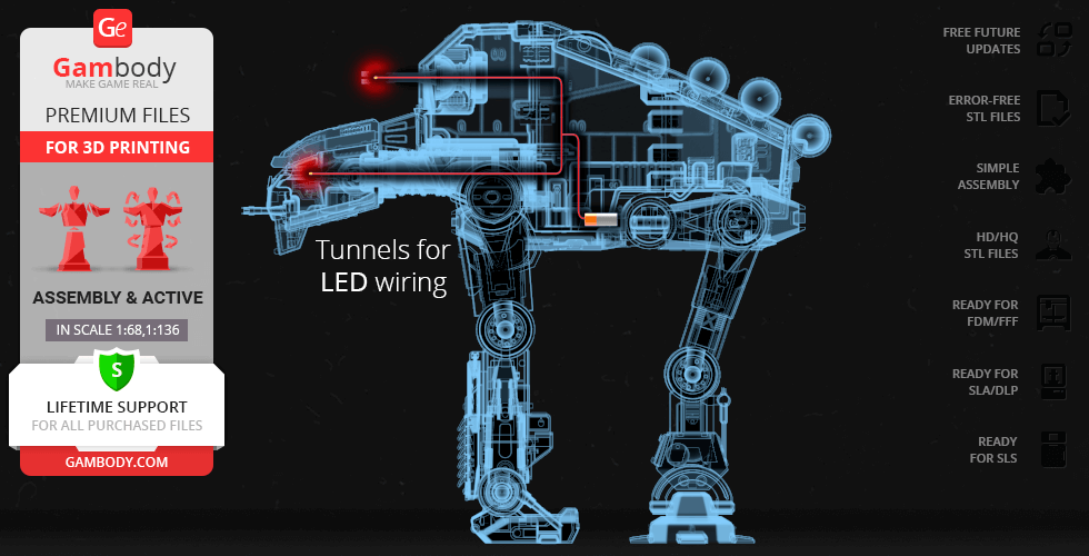 AT-M6 Walker model for 3D printing is an articulated assembly model and its moderation and adaptation for different types of 3D printers took Gambody team 80 hours in total. For you to receive the cleanest printing result possible and to minimise the amount of filament needed for generated support the First Order walker model was divided into many assembly parts, e.g. chin-mounted heavy laser cannons, anti-ship laser canons, flexible armoured tunnel, the turbolaser fuel cells and the leg joints are provided as separate STL files. The connecting elements of AT-M6’s hip and knee joints were developed to ensure the legs’ articulation. Moreover, the ‘ankle drive motors’ of the rear legs were designed in such a way to ensure the footpad’s multidirectional movement. Both anti-ship laser cannons and the cockpit’s lid are movable as well. The glass cover of the cockpit is also provided as three separate files for you to print it using transparent filament. There can also be found special tunnels leading into the cockpit and MegaCaliber Six turbolaser cannon that were designed by our team for you to easily introduce LED wiring. All the assembly parts are provided in STL files in recommended positions that were worked out so to ensure the smoothness of the details’ surfaces after printing and so that the 3D printing beginners won't face difficulties when placing the parts on a build plate.