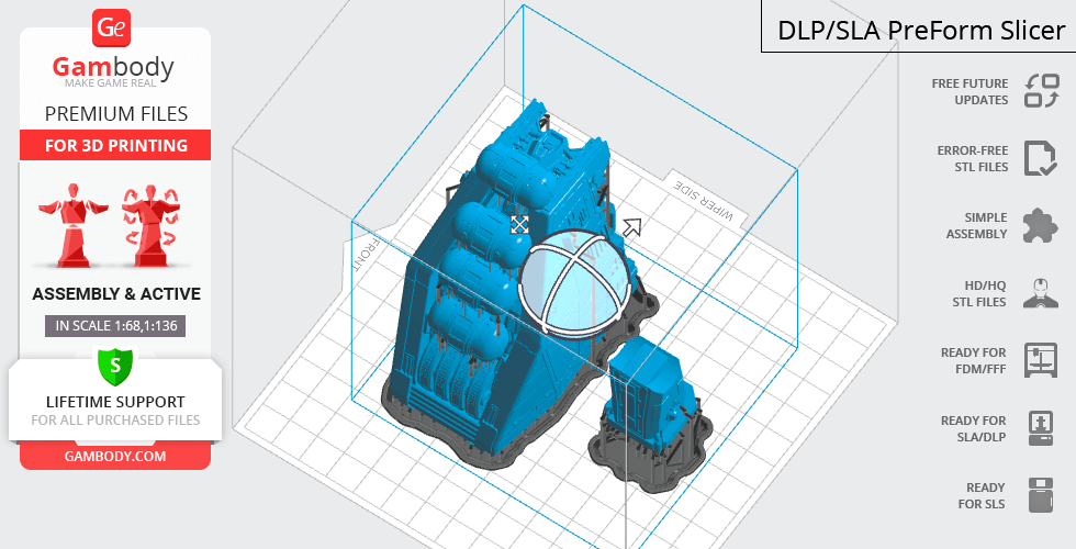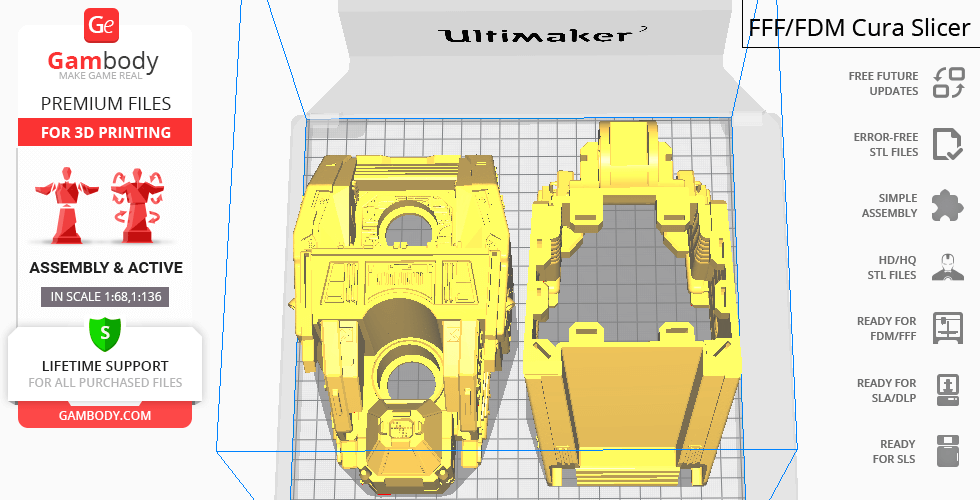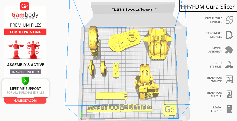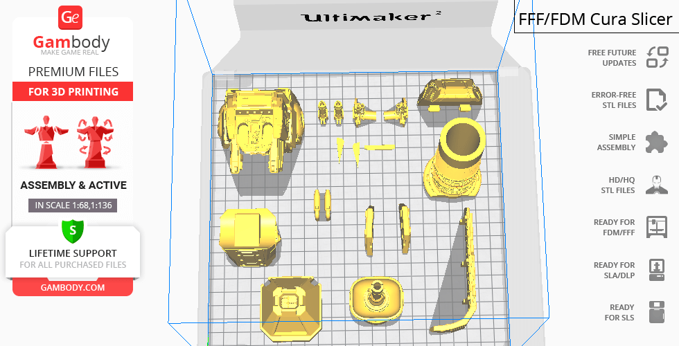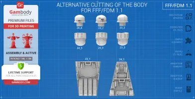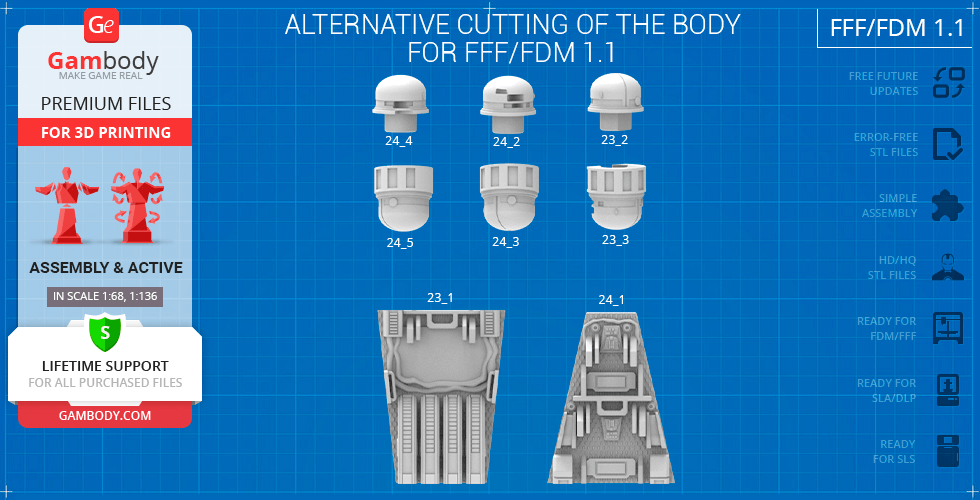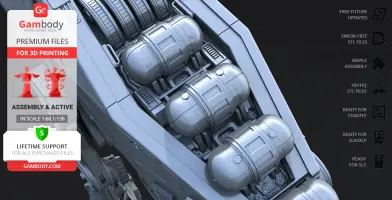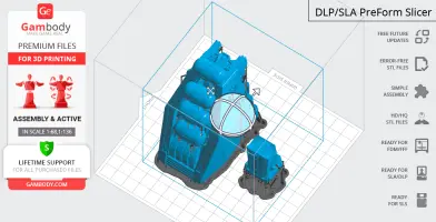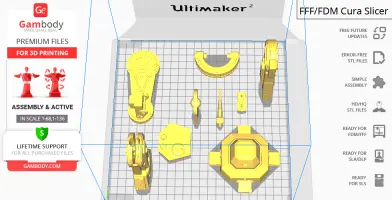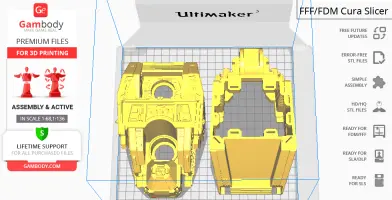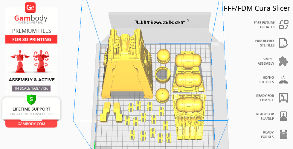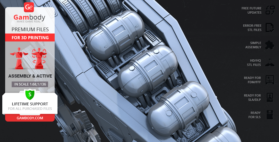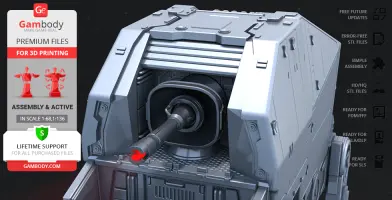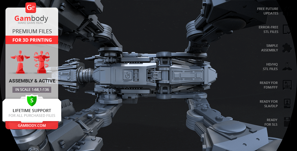 AT-M6 Walker model for 3D printing is an articulated assembly model and its moderation and adaptation for different types of 3D printers took Gambody team 80 hours in total. For you to receive the cleanest printing result possible and to minimise the amount of filament needed for generated support the First Order walker model was divided into many assembly parts, e.g. chin-mounted heavy laser cannons, anti-ship laser canons, flexible armoured tunnel, the turbolaser fuel cells and the leg joints are provided as separate STL files. The connecting elements of AT-M6’s hip and knee joints were developed to ensure the legs’ articulation. Moreover, the ‘ankle drive motors’ of the rear legs were designed in such a way to ensure the footpad’s multidirectional movement. Both anti-ship laser cannons and the cockpit’s lid are movable as well. The glass cover of the cockpit is also provided as three separate files for you to print it using transparent filament. There can also be found special tunnels leading into the cockpit and MegaCaliber Six turbolaser cannon that were designed by our team for you to easily introduce LED wiring. All the assembly parts are provided in STL files in recommended positions that were worked out so to ensure the smoothness of the details’ surfaces after printing and so that the 3D printing beginners won't face difficulties when placing the parts on a build plate.