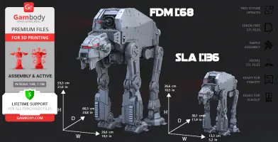 The model's scale was calculated from the AT-M6 Walker's actual length that is 40870 mm. The 3D printing model's chosen scale is 1/68 for the FFF/FDM version and 1/136 for the DLP/SLA version.