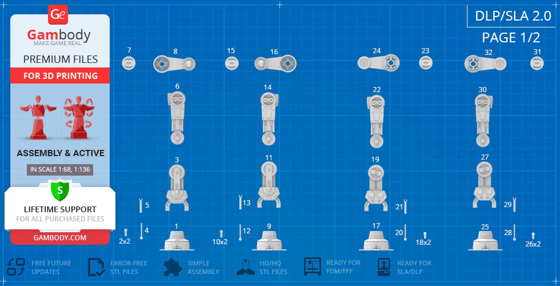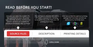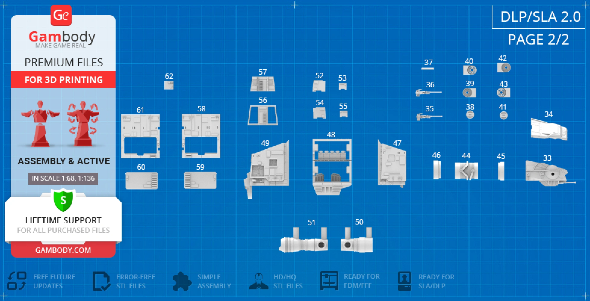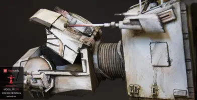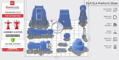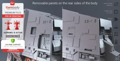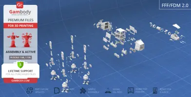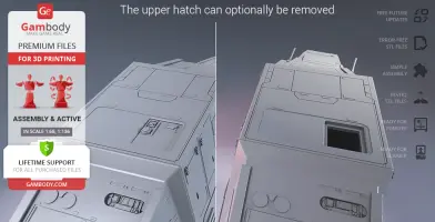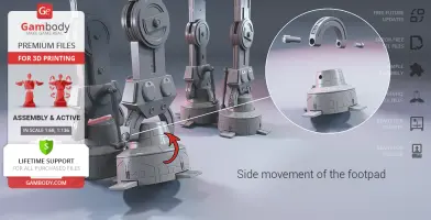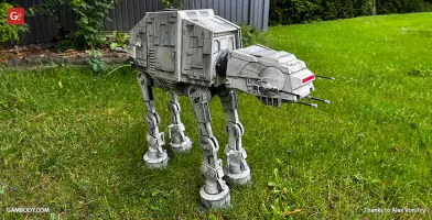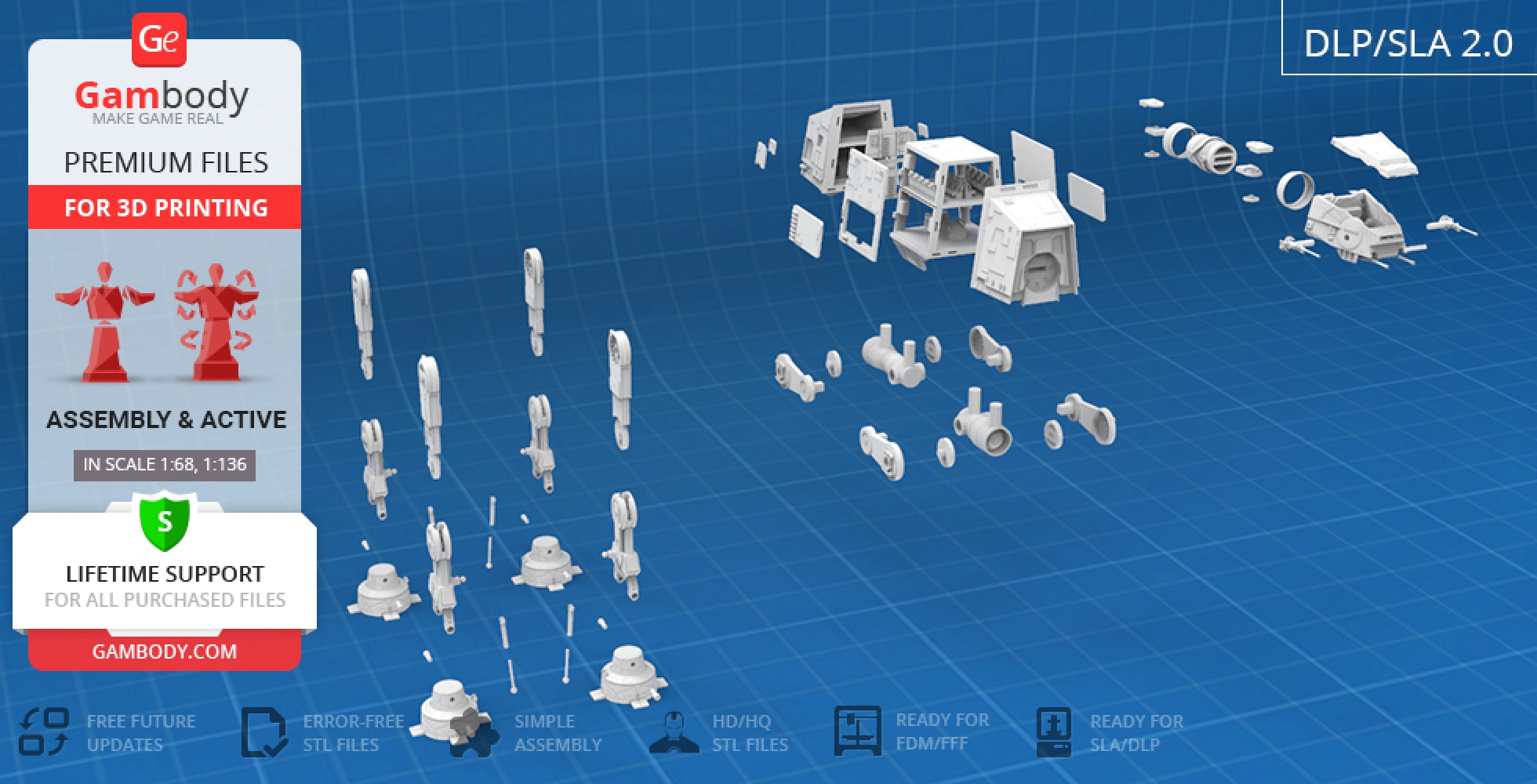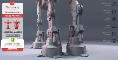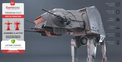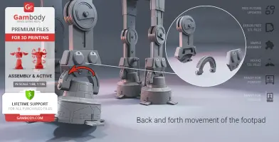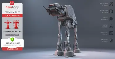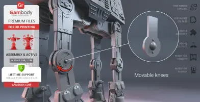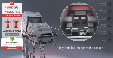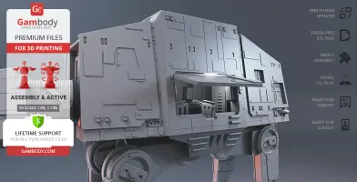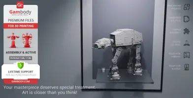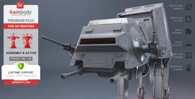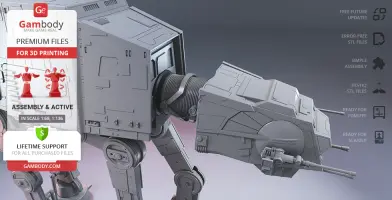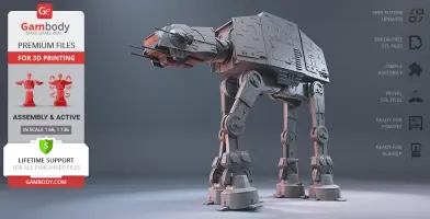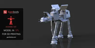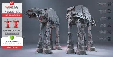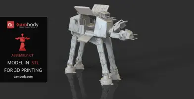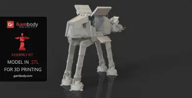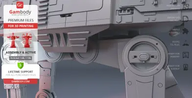 AT-AT Walker 3D printing design is an active assembly model and its updating and adaptation for different types of 3D printers took Gambody team 75 hours in total. Due to the fact that this model was first released on Gambody back in 2015, for all the Star Wars fans to print the best Walker possible, the model was upgraded from the ground up, cut into assembly parts anew, equipped with the latest developed articulated connecting elements and adapted for different types of 3D printers taking into account the present-day technology advancements. What is more, when preparing the model's update its level of detail and accuracy were significantly enhanced. Thus, for you to receive the cleanest 3D printing result possible and to minimize the amount of filament needed for generated support the Walker model was divided into many assembly parts, e.g. its blaster cannons, footpads, various hatches, viewport, heavy laser cannons, toe flaps, etc. are provided as separate STL files.
