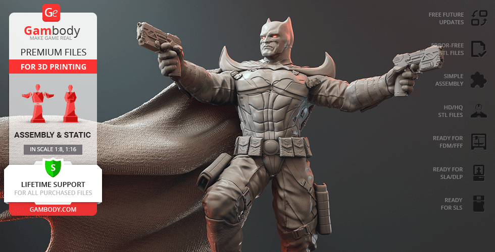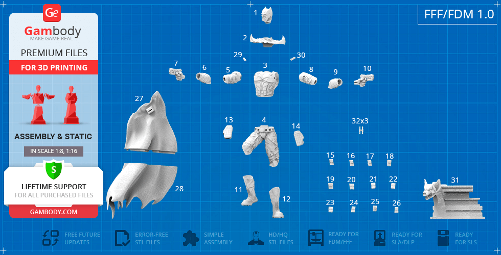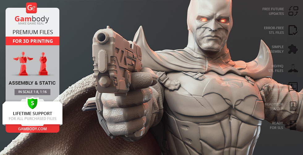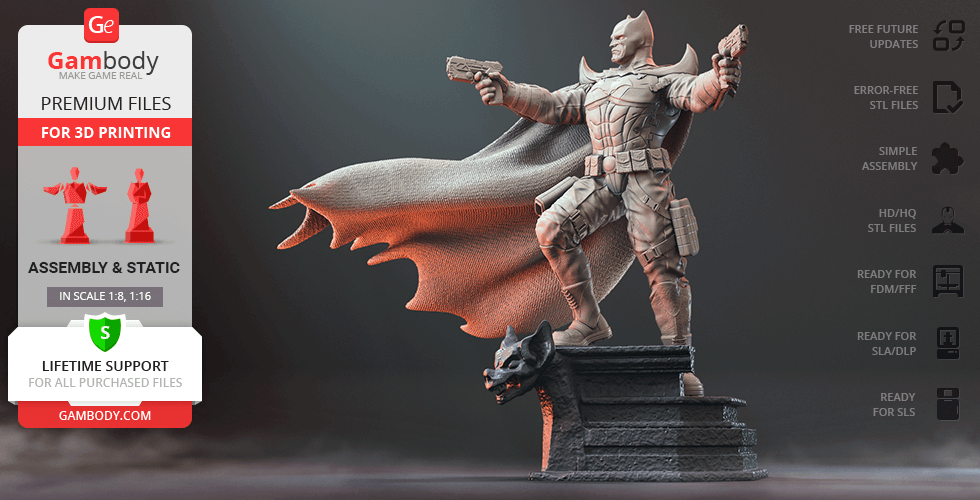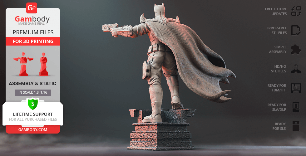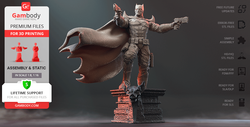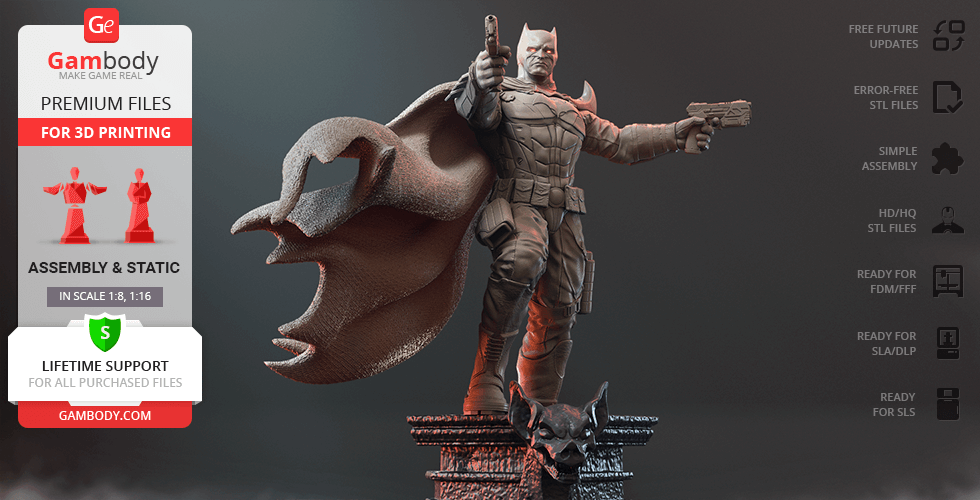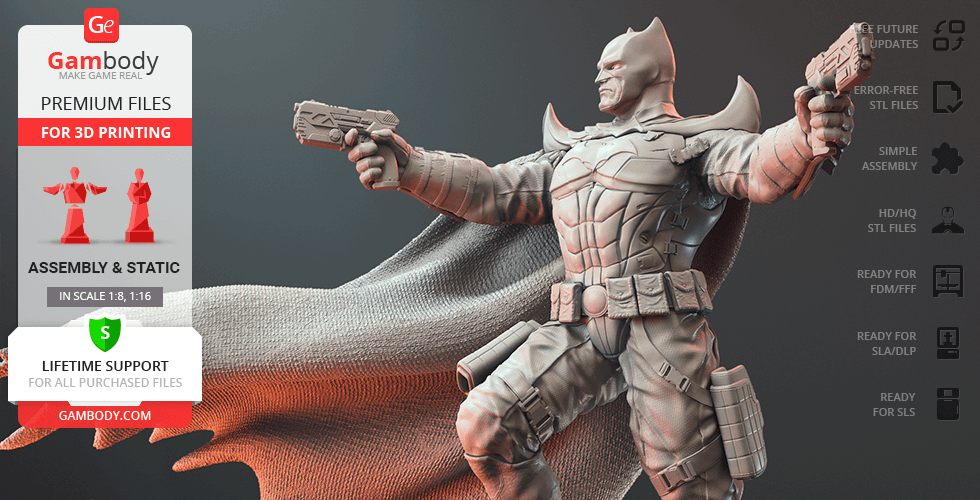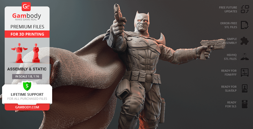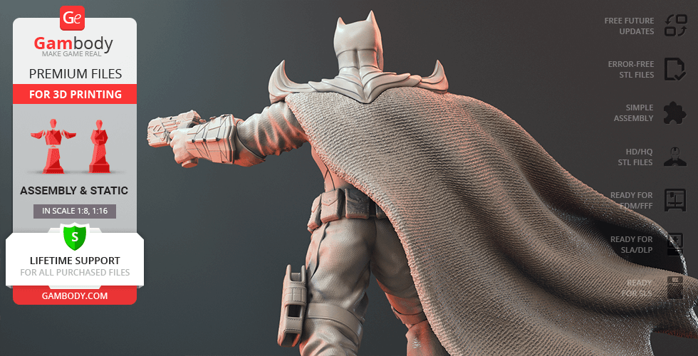 Batman Thomas Wayne figurine for 3D printing is a static assembly model and its moderation and adaptation for different types of 3D printers took Gambody team 48 hours in total. Figurine’s anatomy was thoroughly reviewed during the moderation process for the Batman from the Flashpoint timeline to be depicted harmoniously in the intended pose. The model’s cutting was chosen by our team to minimise the amount of filament needed for generated support and some of the parts were hollowed out for you to save resin in the figurine’s Eco version. For you to receive the cleanest result possible, Batman’s cape was completely “taken off” the figurine and is to be printed and assembled separately. Also, the 12 pouches attached to the Batman’s Utility Belt, cape clasps, and both leg holsters have been separated as well. In order to conceal the places where the assembly parts of the model must be connected, the figurine was cut along the contour of its suit seams, the boots were “taken off” and the head separated along the suit’s neckline. All the assembly parts come in STL files in recommended positions that were worked out in order to ensure the smoothness of the details’ surfaces after printing and so that the 3D printing beginners won't face difficulties when placing the parts on a build plate. When downloading any figurine's file you will also receive "Assembly Manual" for FFF/FDM 1.0 and DLP/SLA 1.0 versions in PDF format.