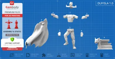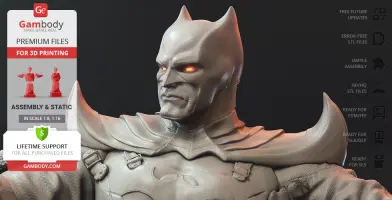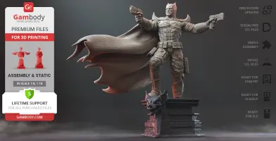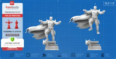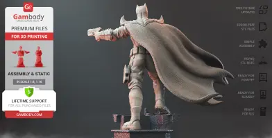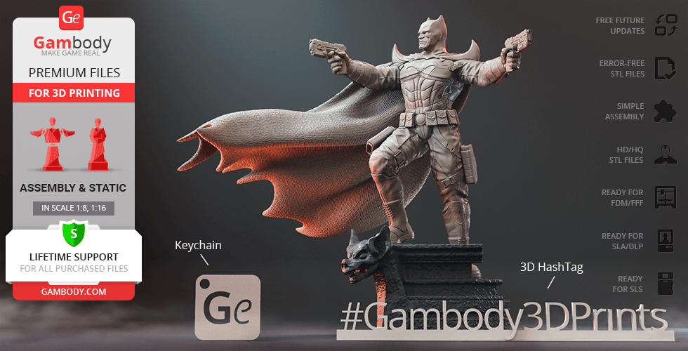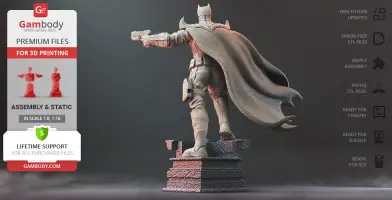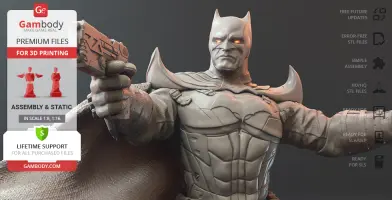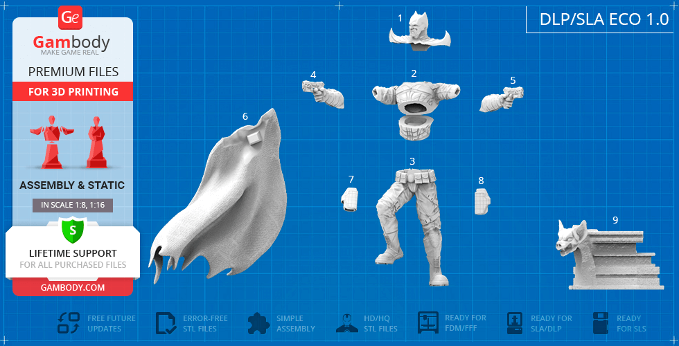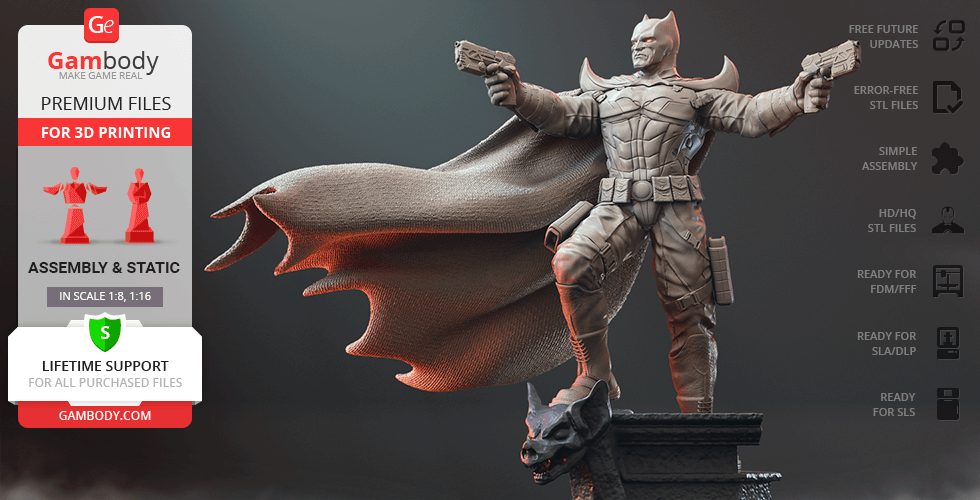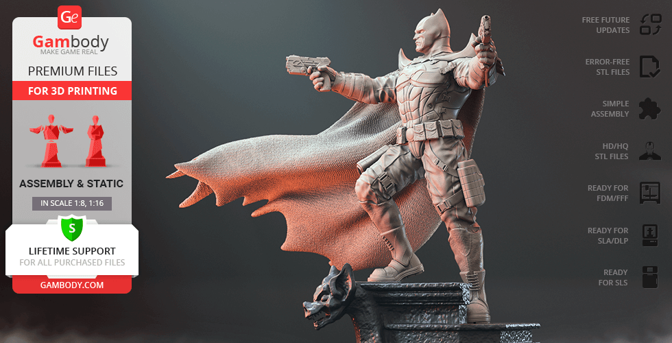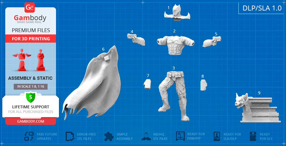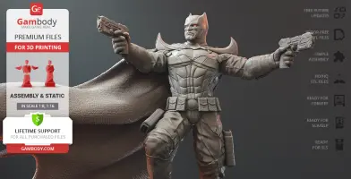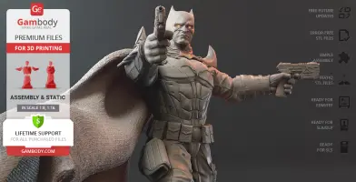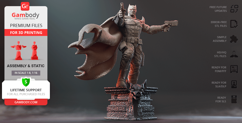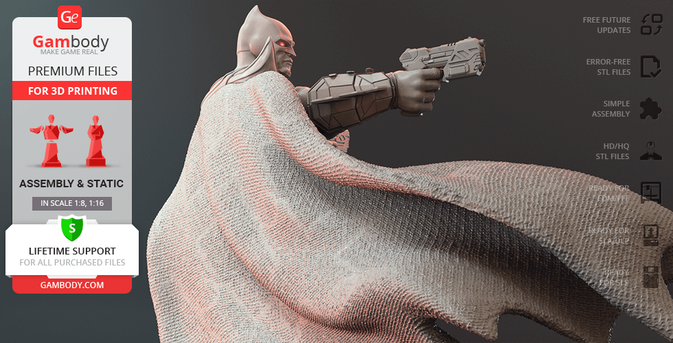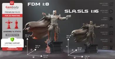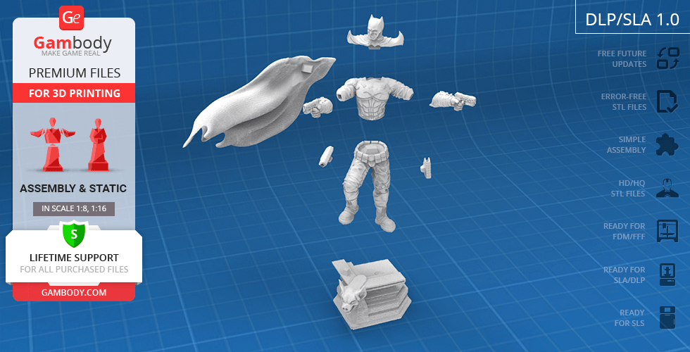 Batman Thomas Wayne figurine for 3D printing is a static assembly model and its moderation and adaptation for different types of 3D printers took Gambody team 48 hours in total. Figurine’s anatomy was thoroughly reviewed during the moderation process for the Batman from the Flashpoint timeline to be depicted harmoniously in the intended pose. The model’s cutting was chosen by our team to minimise the amount of filament needed for generated support and some of the parts were hollowed out for you to save resin in the figurine’s Eco version. For you to receive the cleanest result possible, Batman’s cape was completely “taken off” the figurine and is to be printed and assembled separately. Also, the 12 pouches attached to the Batman’s Utility Belt, cape clasps, and both leg holsters have been separated as well. In order to conceal the places where the assembly parts of the model must be connected, the figurine was cut along the contour of its suit seams, the boots were “taken off” and the head separated along the suit’s neckline. All the assembly parts come in STL files in recommended positions that were worked out in order to ensure the smoothness of the details’ surfaces after printing and so that the 3D printing beginners won't face difficulties when placing the parts on a build plate. When downloading any figurine's file you will also receive "Assembly Manual" for FFF/FDM 1.0 and DLP/SLA 1.0 versions in PDF format.