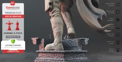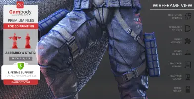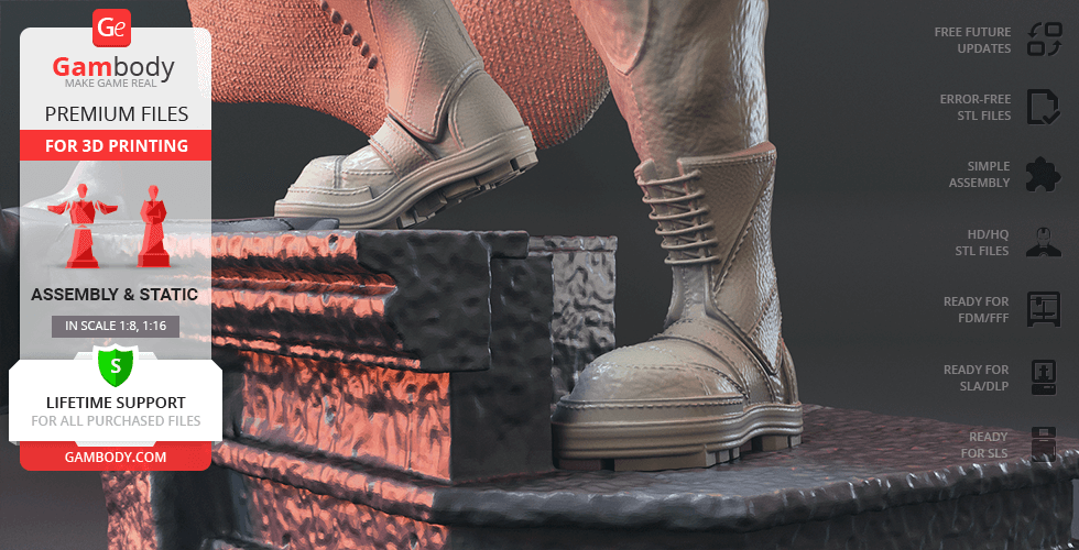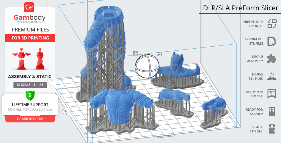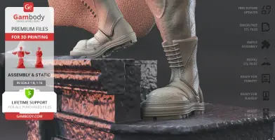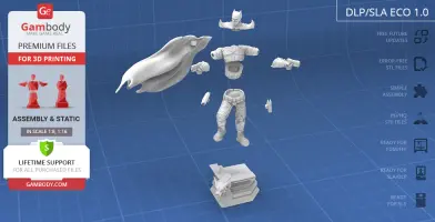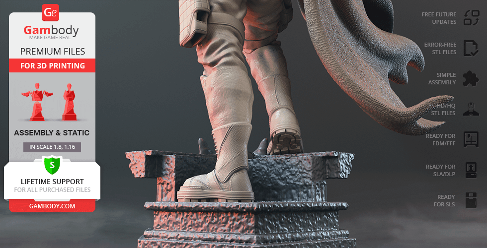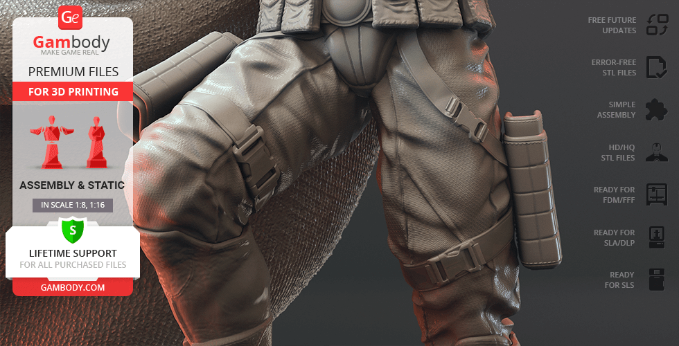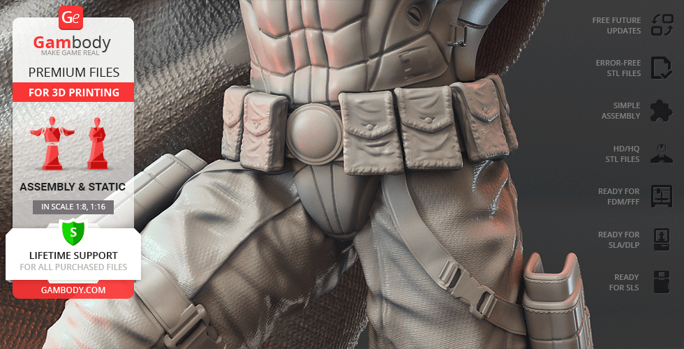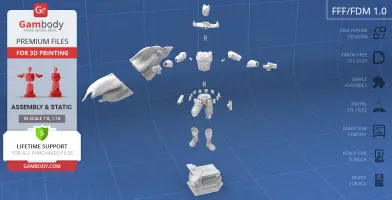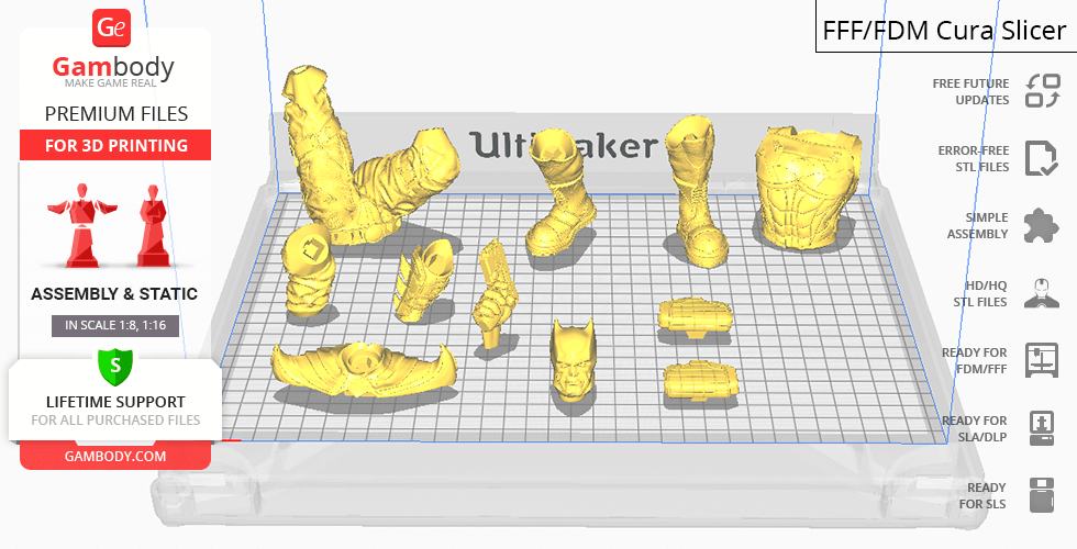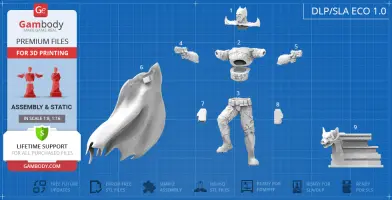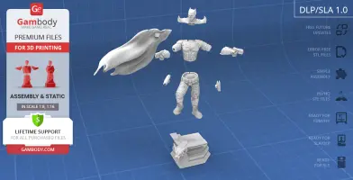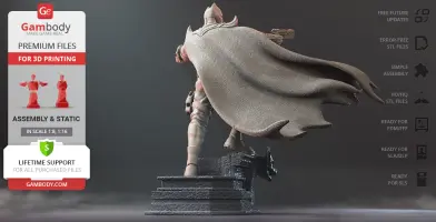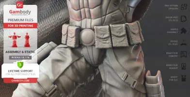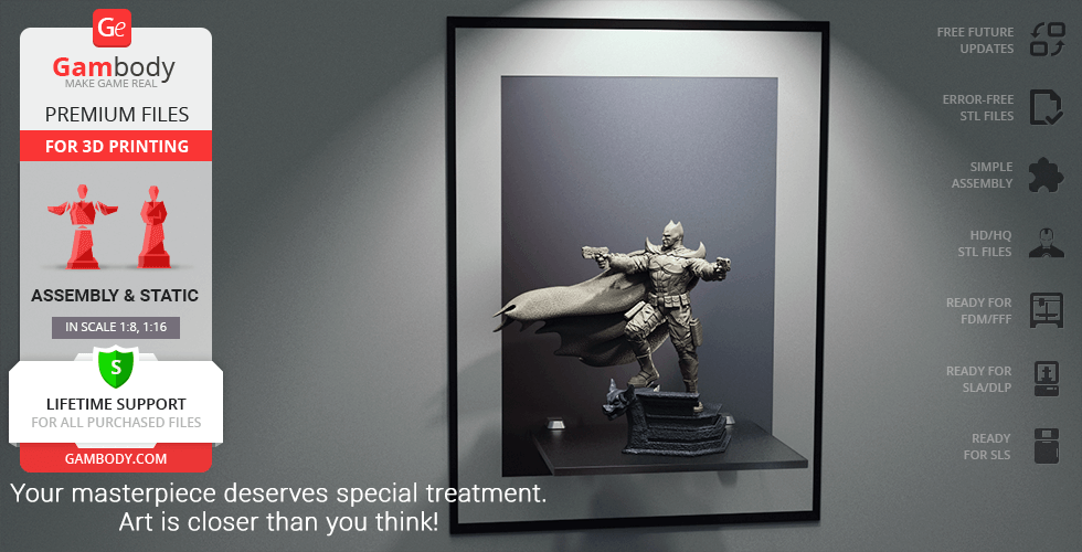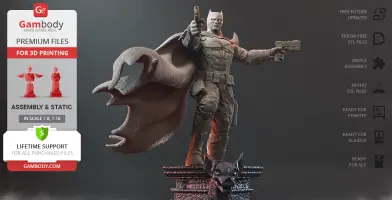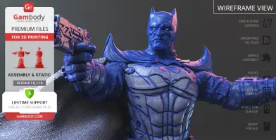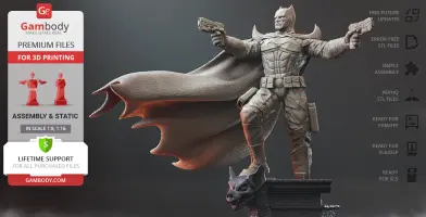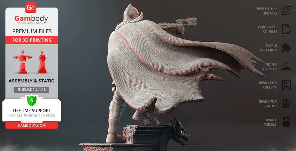 Batman Thomas Wayne figurine for 3D printing is a static assembly model and its moderation and adaptation for different types of 3D printers took Gambody team 48 hours in total. Figurine’s anatomy was thoroughly reviewed during the moderation process for the Batman from the Flashpoint timeline to be depicted harmoniously in the intended pose. The model’s cutting was chosen by our team to minimise the amount of filament needed for generated support and some of the parts were hollowed out for you to save resin in the figurine’s Eco version. For you to receive the cleanest result possible, Batman’s cape was completely “taken off” the figurine and is to be printed and assembled separately. Also, the 12 pouches attached to the Batman’s Utility Belt, cape clasps, and both leg holsters have been separated as well. In order to conceal the places where the assembly parts of the model must be connected, the figurine was cut along the contour of its suit seams, the boots were “taken off” and the head separated along the suit’s neckline. All the assembly parts come in STL files in recommended positions that were worked out in order to ensure the smoothness of the details’ surfaces after printing and so that the 3D printing beginners won't face difficulties when placing the parts on a build plate. When downloading any figurine's file you will also receive "Assembly Manual" for FFF/FDM 1.0 and DLP/SLA 1.0 versions in PDF format.
