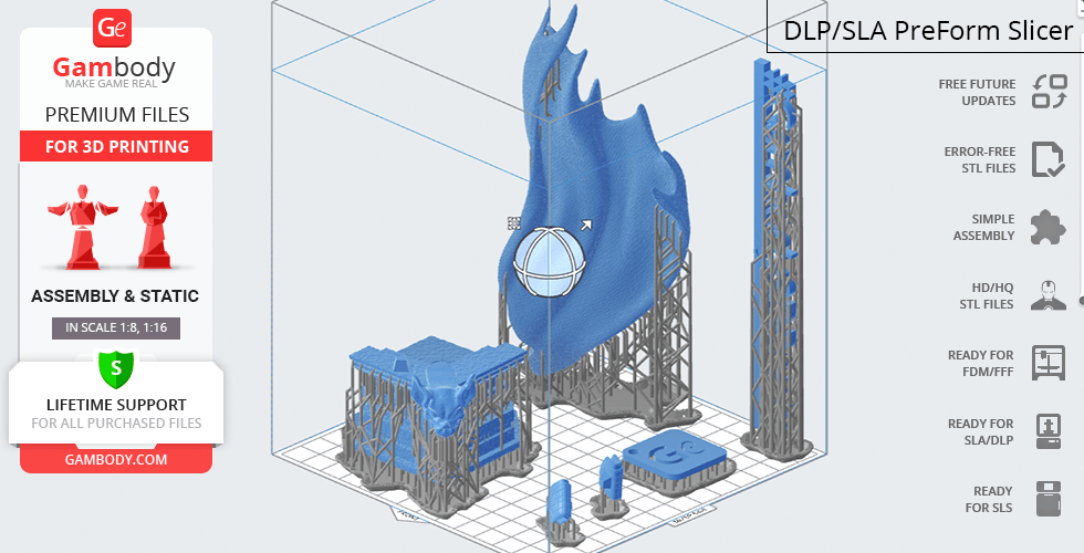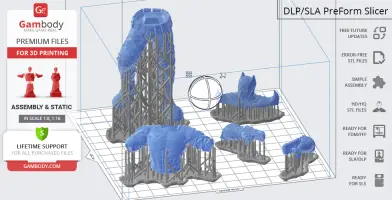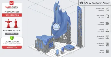 DLP/SLA 1.0 version features:- Contains 9 parts;- A printed model is 145 mm tall, 156 mm wide, 80 mm deep;- Stands on a fragment of a column adorned with bat-like gargoyle;- All parts are divided in such a way to fit the build plates and to ensure that support structures are generated where needed.