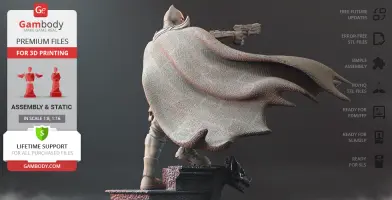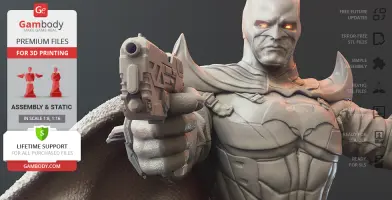 In an alternative “Flashpoint” timeline, Thomas and Martha Wayne survive but witness their son Bruce being murdered by a mugger instead. In this continuity, Thomas Wayne becomes The Dark Knight and fights against the evil sparing no criminal on his way. The author of the Thomas Wayne figurine for 3D printing spent circa 190 hours in order for the ruthless version of Batman to be portrayed in all its glory. The 3D printing knight of vengeance is depicted standing on a fragment of a building that is adorned with the head of a large bat-like gargoyle. The scene most likely takes place somewhere in the middle of the crime-ridden Gotham City so it is no surprise that the figurine is wielding two bulky guns, pointed at different directions. The 3D artist made sure to include all the trademark peculiarities that differ the Batsuit of the Flashpoint timeline from the rest of the variations. Thus, the shoulder protrusions of Thomas Wayne’s suit are rather large and spiky, while the ears are short and neat. It must be pretty windy in Gotham City since Batman’s heavy cape won’t hang still - it flutters behind the vigilante’s back, revealing the intricate “fabric” of the 3D printing cloak. Wayne’s Utility Belt is equipped with twelve pouches that are for sure filled with every needed emergency tool in fighting crime. There are also two large holsters on Batman’s legs that are fixed with the help of several highly-detailed sets of belts. Thomas Wayne in Batman mantle undoubtedly looks very intimidating and powerful which clearly justifies his reputation of a far more violent Caped Crusader. Batman of the alternative Flashpoint timeline would look majestic among your 3D printed DC collection!