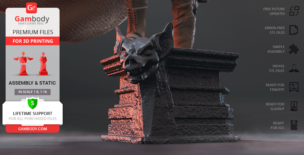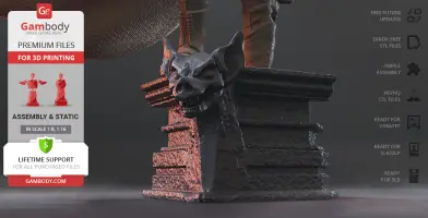 FFF/FDM 1.0 version features:- Contains 32 parts;- A printed model is 290 mm tall, 312 mm wide, 160 mm deep;- Assembly kit includes lock 32_ge_lock_10H(x3) to attach the model's parts securely without glue that needs to be printed 3 times;- Stands on a fragment of a column adorned with bat-like gargoyle;- All parts are divided in such a way that you will print them with the smallest number of support structures.