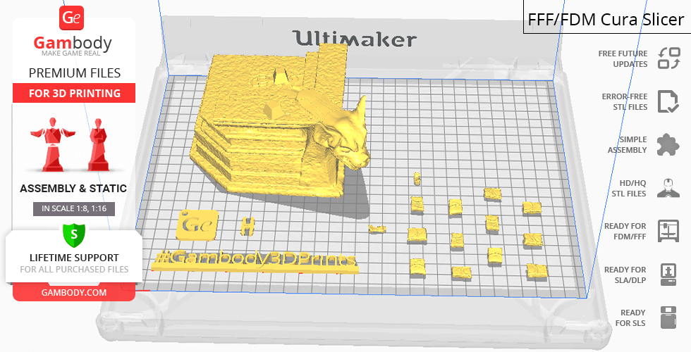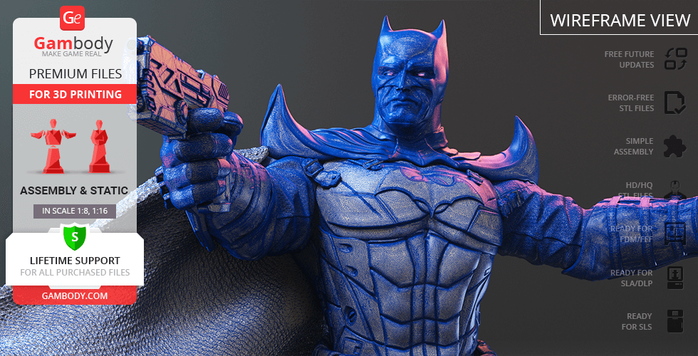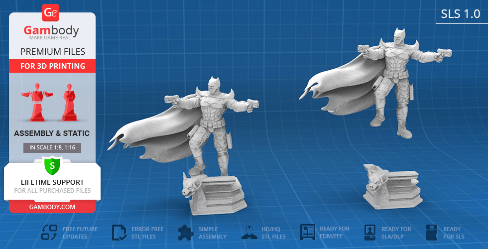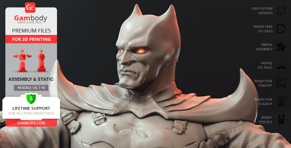 - STL files of Batman Thomas Wayne 3D Figurine for 3D printing which consist of 53 parts;- 4 versions of files for this model for FFF/FDM, DLP/SLA, DLP/SLA Eco and SLS;- High-poly detailed figurine of Batman Thomas Wayne;- Assembly Manual for FFF/FDM 1.0 and DLP/SLA 1.0 versions in PDF format;- Detailed settings that we provide as a recommendation for Cura , Simplify3D and Slic3r for the best print;- Full technical support from the Gambody Support Team.