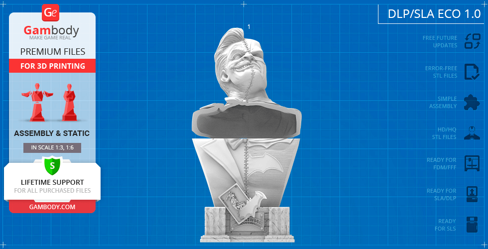 - 3 versions of Batman vs Joker Bust STL files for FFF/FDM, DLP/SLA, and DLP/SLA Eco — files for all versions are available for download after the purchase;