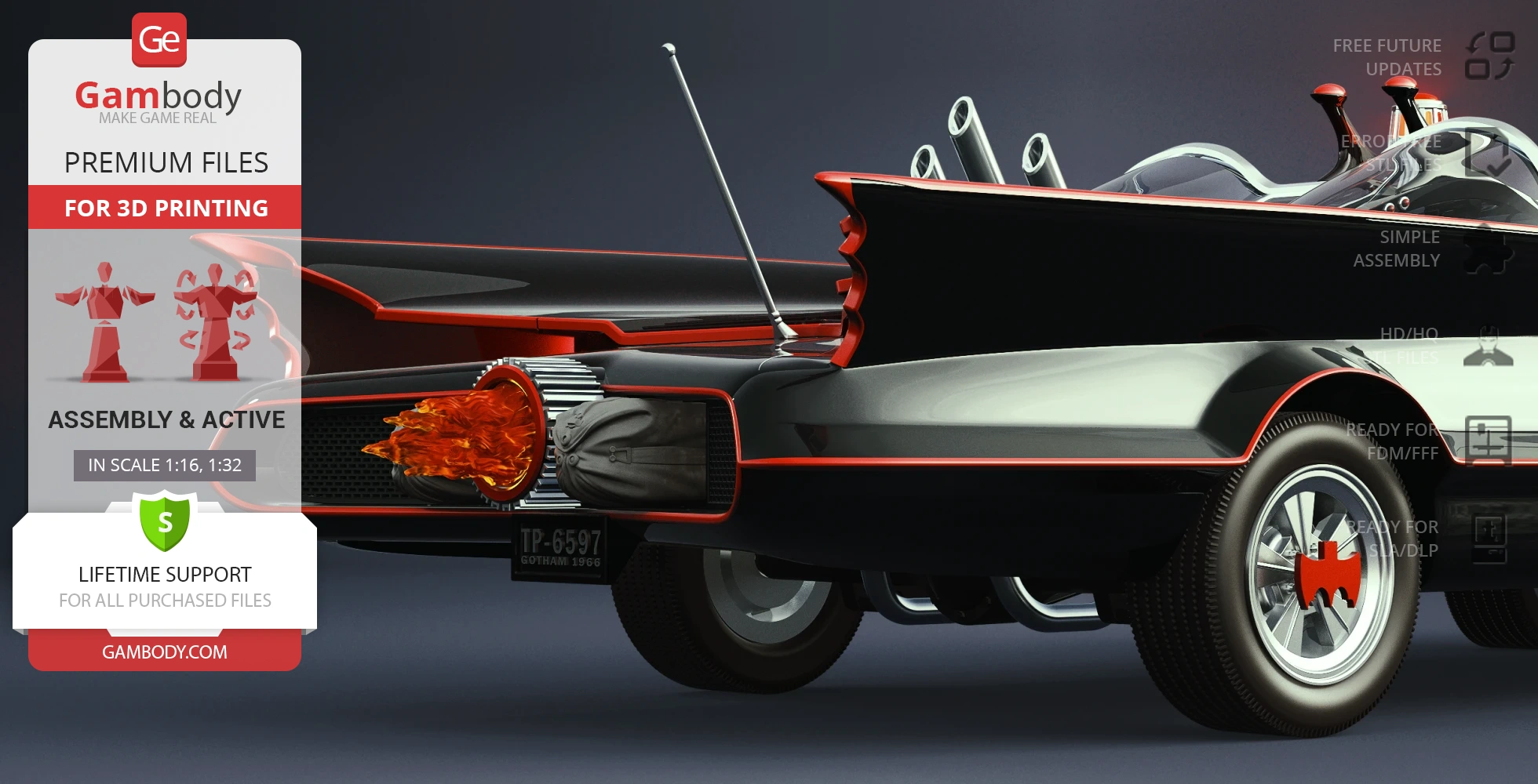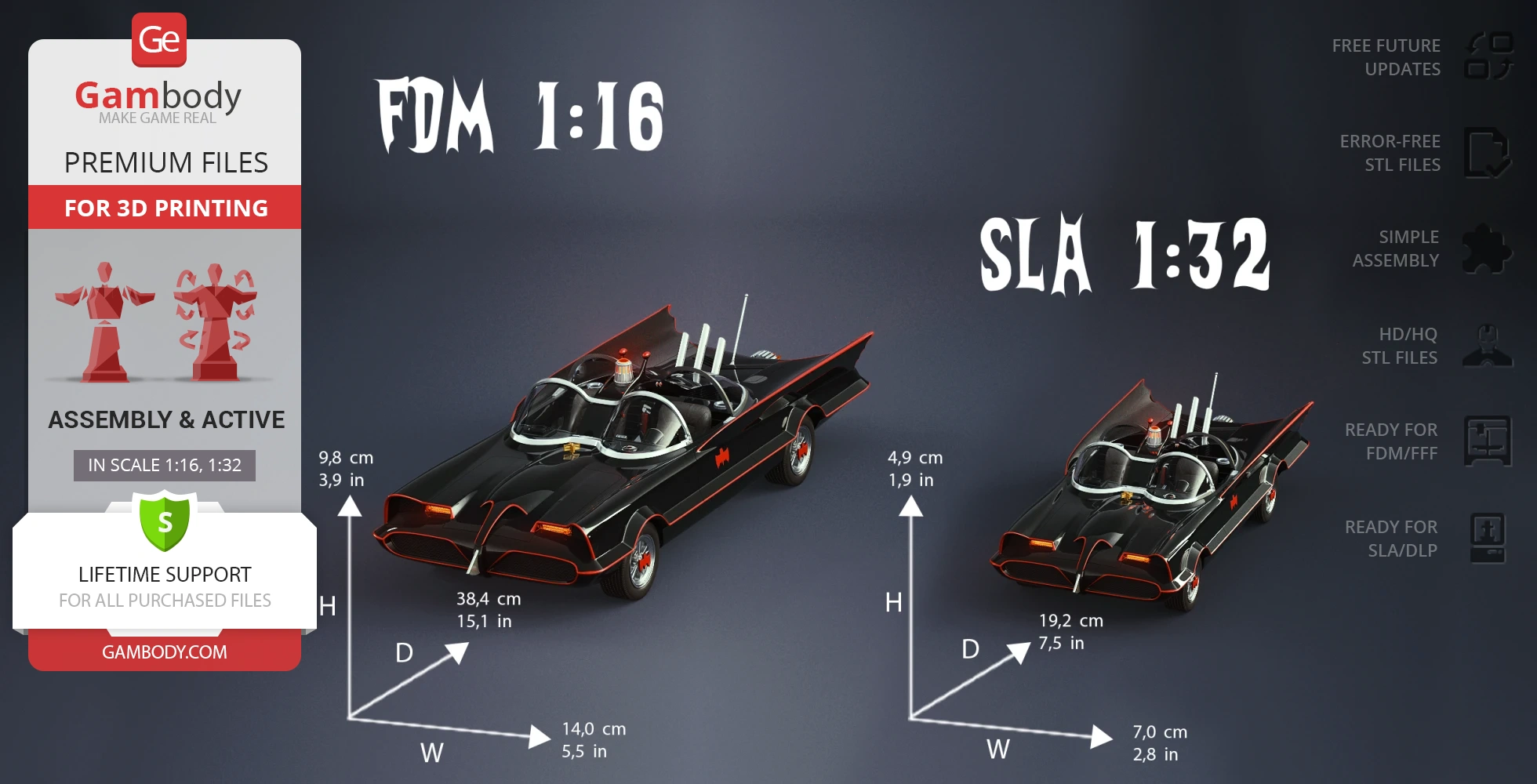 2 versions of 1966 Batmobile STL files for FFF/FDM and DLP/SLA — files for all versions are available for download after the purchase;