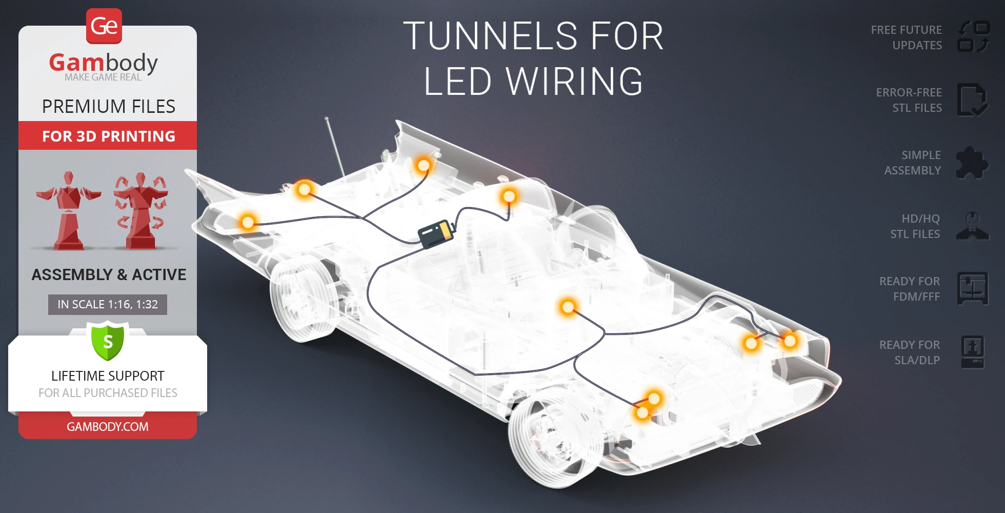 Active suspension; Opening hood/trunk/doors; Rotating wheels, articulated front-wheel steering, and movable Bat-turn lever; Highly detailed engine, opening glove compartment, rotating antenna, two hull variants; Integrated wiring tunnels for multiple LEDs: headlights, engine, tail lights, buzzer, thermal camera, flame; Vacuum forming molds for windshield; The assembly parts are connected using specially designed integrated connectors that fit securely into the corresponding slots; The assembly also requires additional pins that can be made out of a short piece of regular 1.75mm filament.