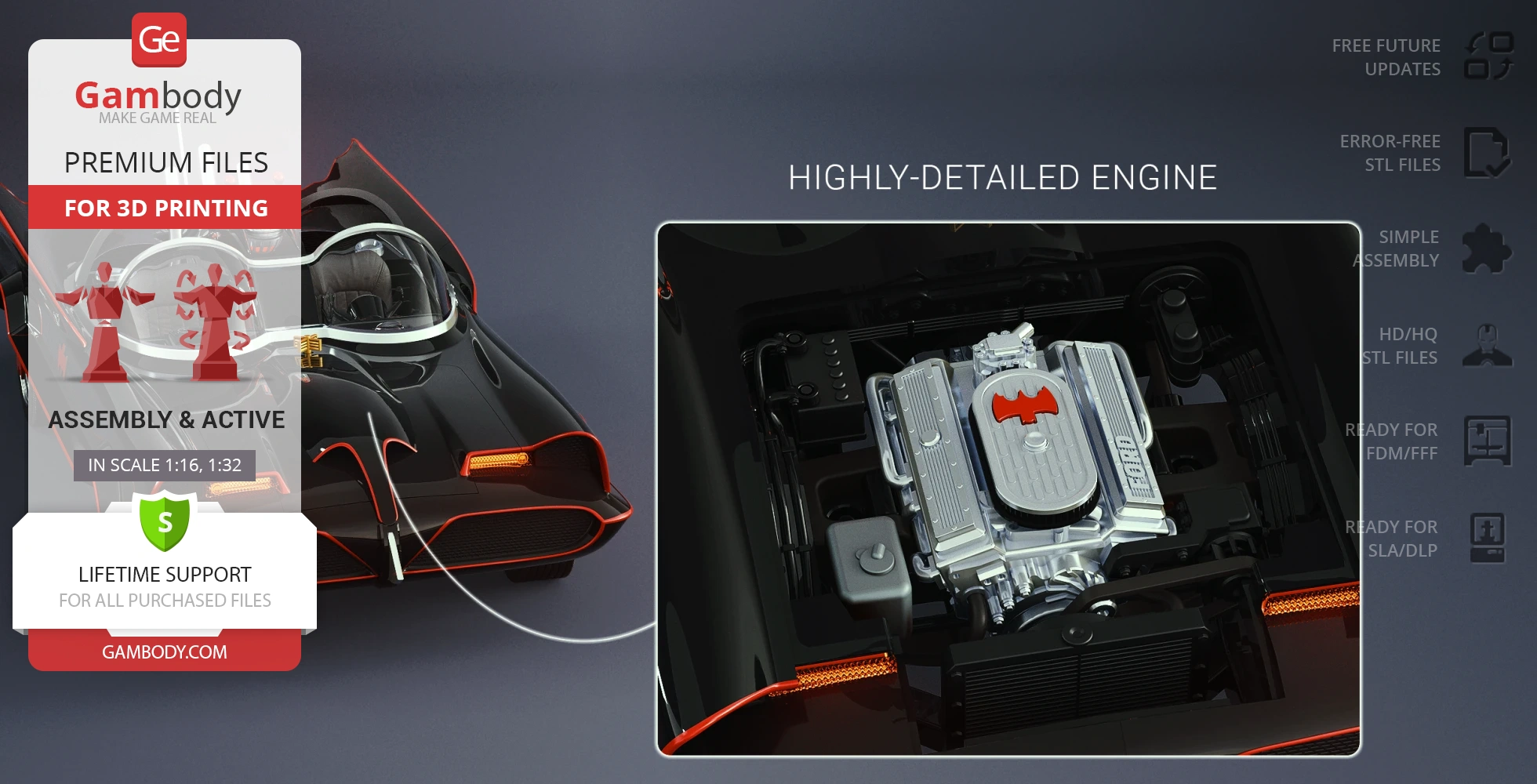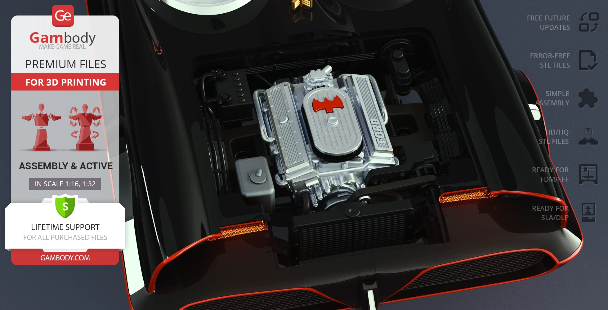4 versions of 1966 BatmobileSTL files for FFF/FDM, DLP/SLA, DLP/SLA Eco, and SLS — files for all versions are available for download after the purchase;