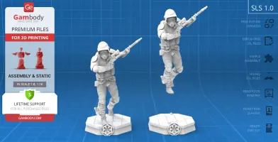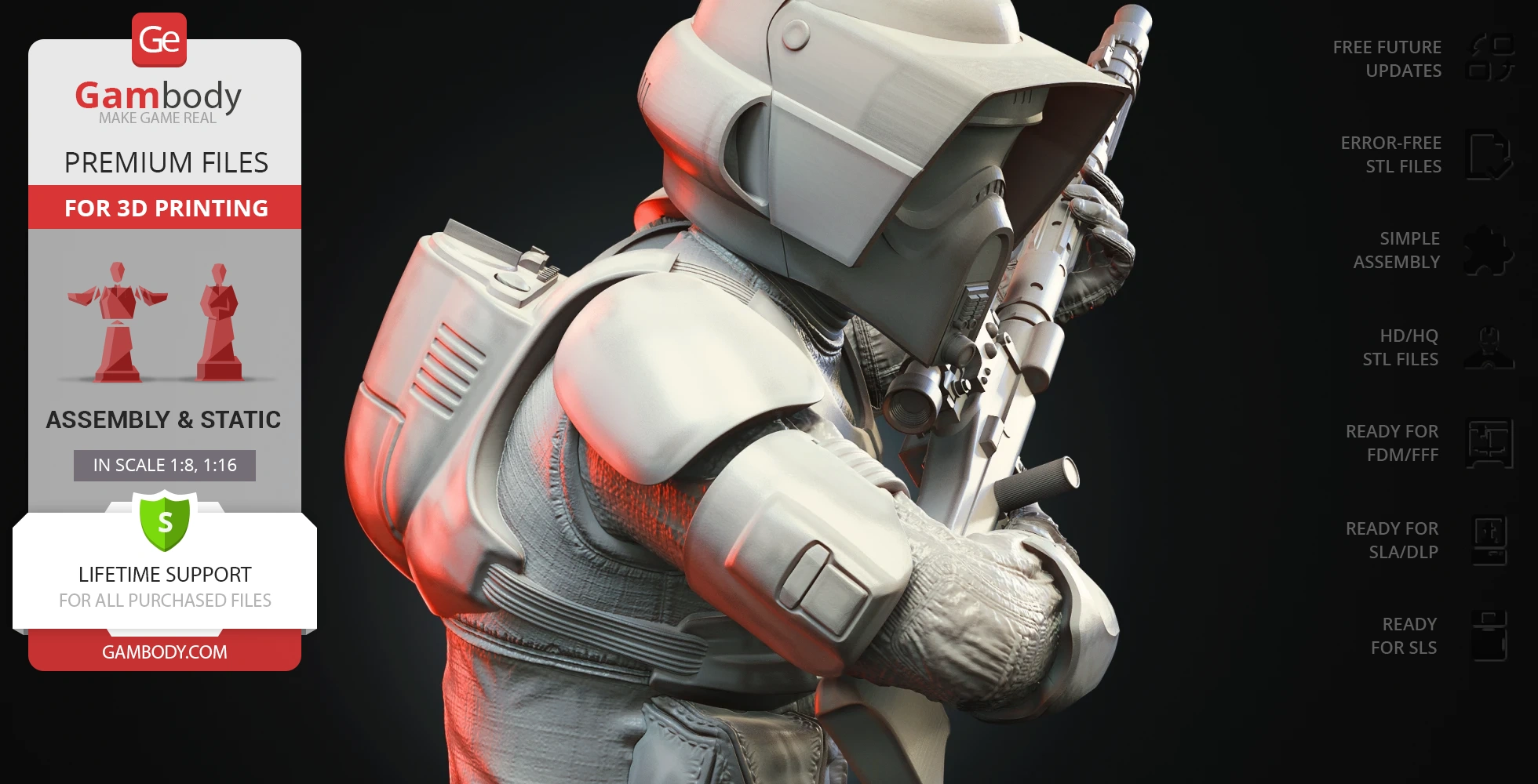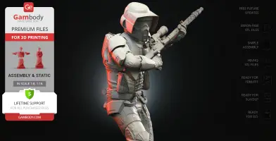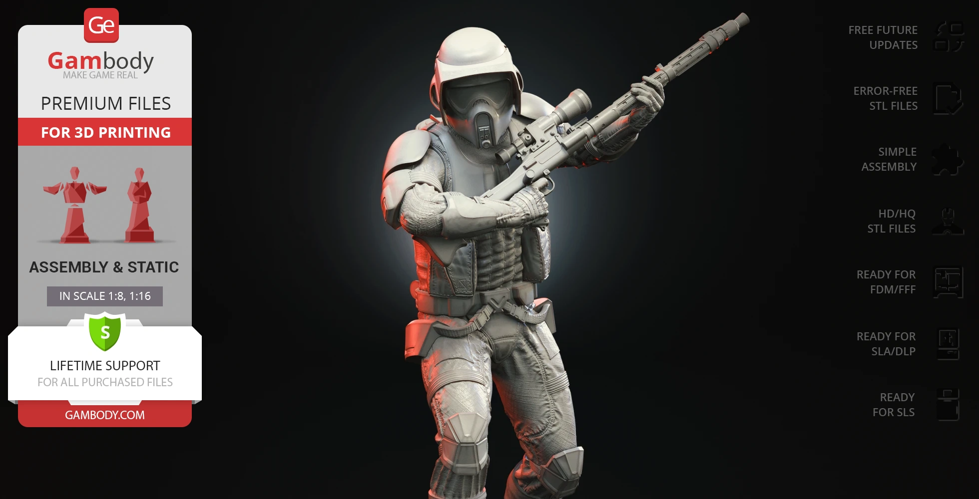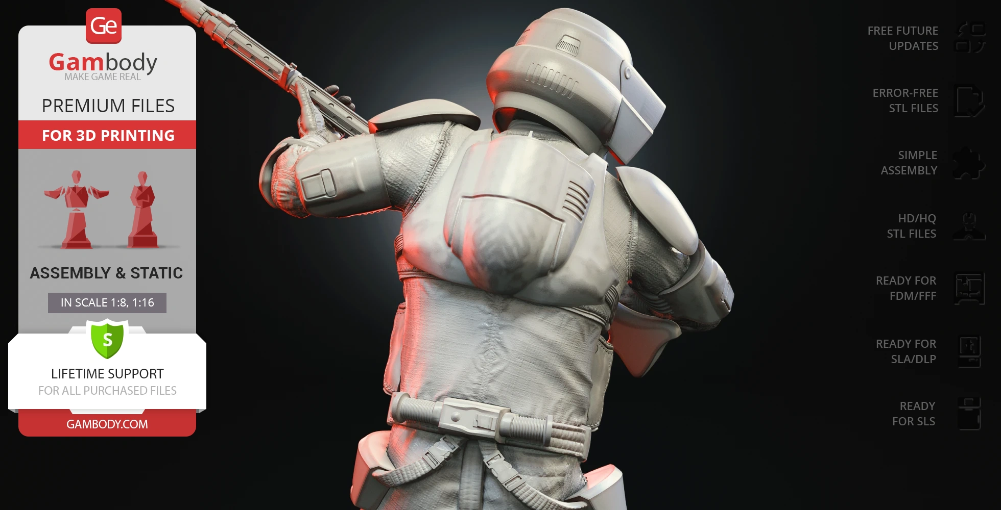Scout Trooper 3D Printer Files | Assembly includes 3 version(s) for the supported 3D printer type(s): FFF/FDM, DLP/SLA, SLS. Files are available for download after purchase.