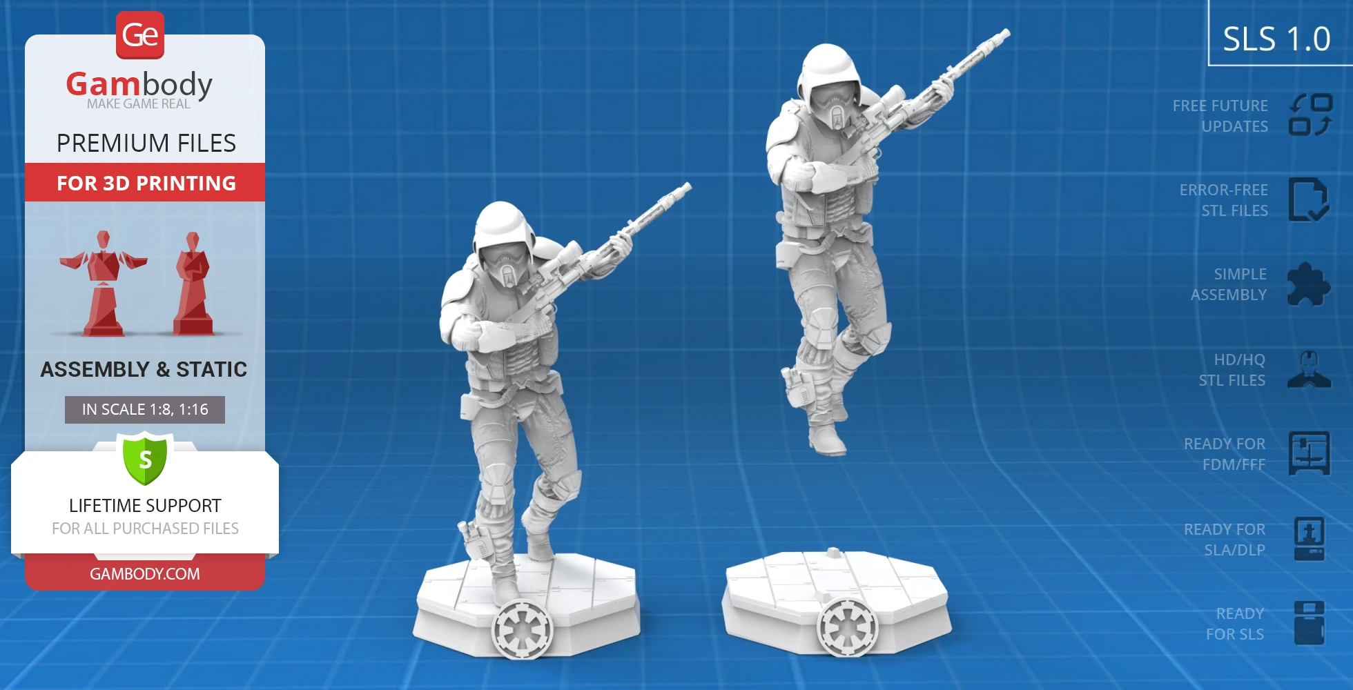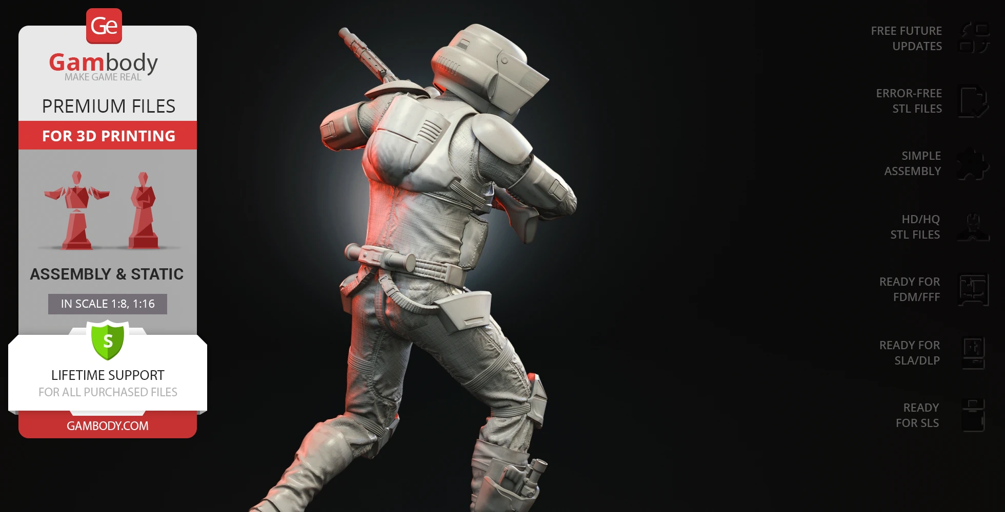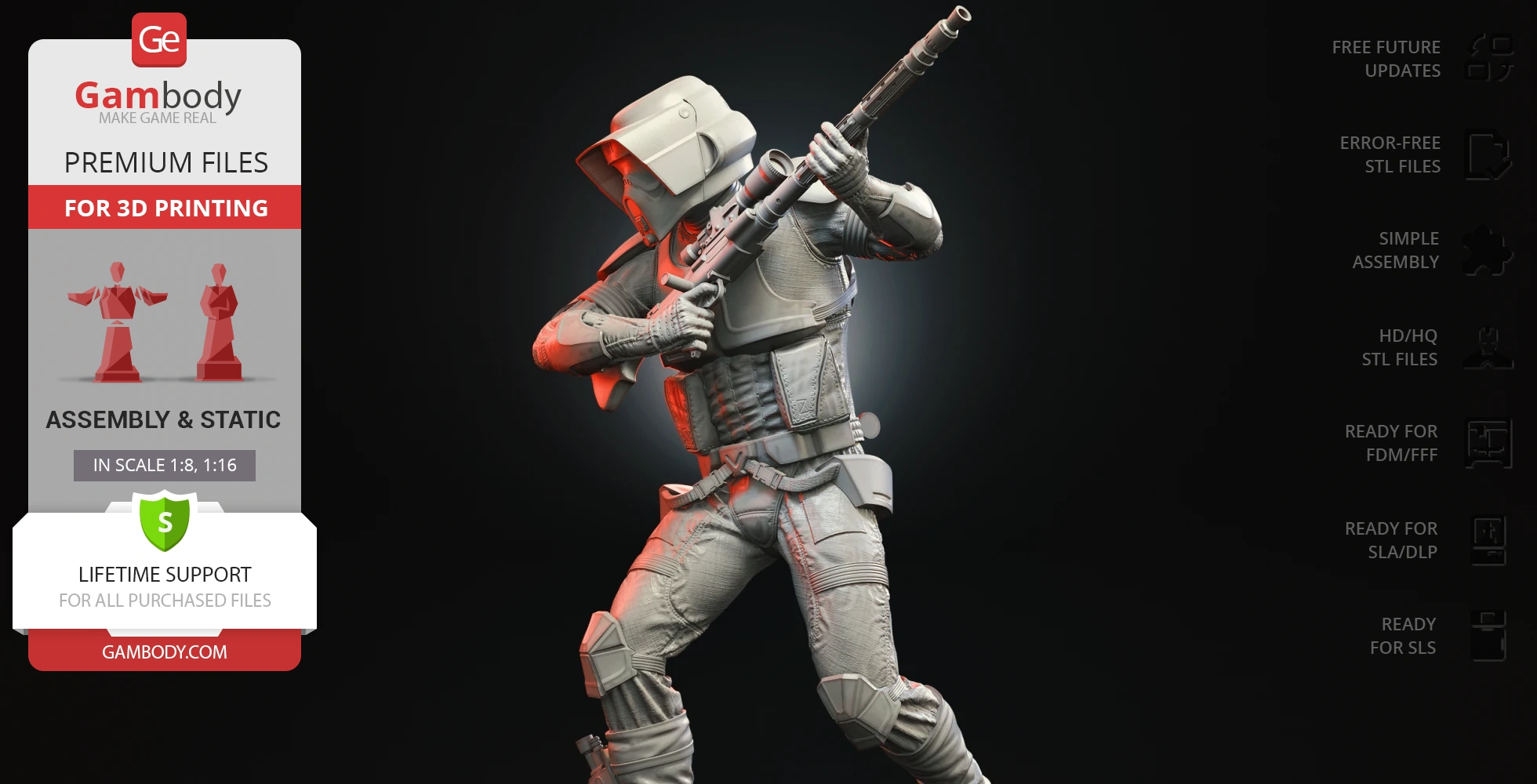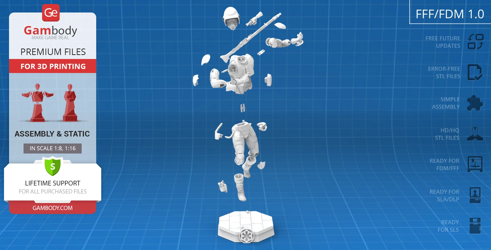 • 4 versions of Scout Trooper STL files for FFF/FDM, DLP/SLA, DLP/SLA Eco, and SLS files for all versions are available for download after the purchase;